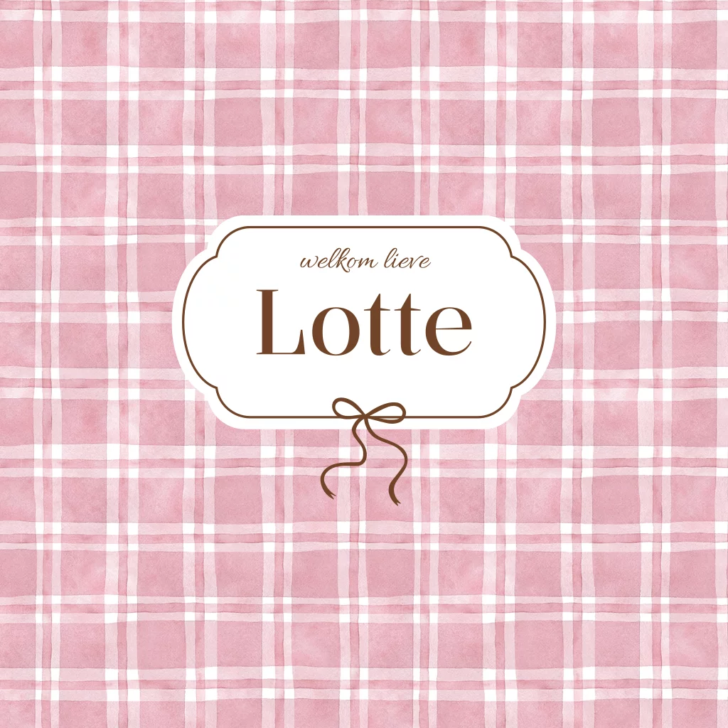 Ontdek dit klassiek geboortekaartje met een prachtig waterverf ruitjespatroon in zacht roze tinten. Het kaartje heeft een tijdloze uitstraling en is voorzien van een trendy gedrukt label met een subtiel bruin strikje. Het zijn rechte ruitjes, we hebben ook schuine ruitjes. Personaliseer eenvoudig met jullie eigen teksten en bestel een drukproef.