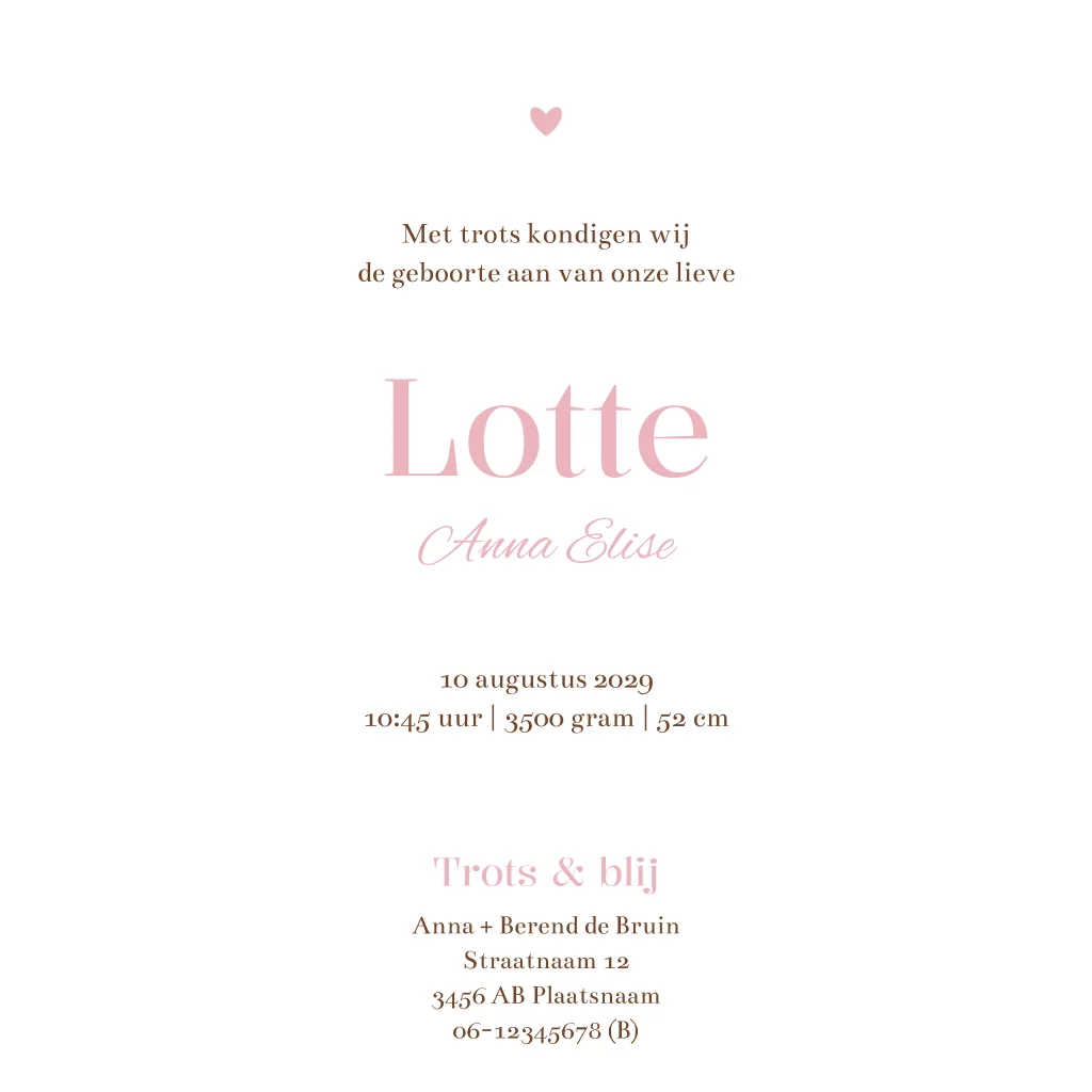 Klassiek geboortekaartje met roze ruitjes en bruin strikje