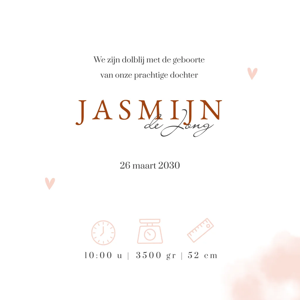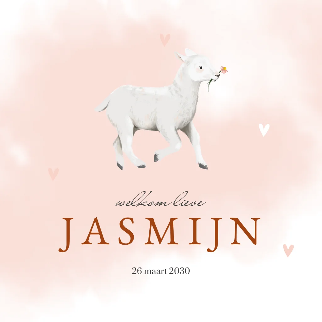 Kondig de geboorte van jullie dochter aan met dit vrolijke kaartje met geïllustreerd lammetje en roze waterverf. Verwacht jij jouw kleine in de lente? Dan is het natuurlijk leuk om hier je geboortekaartje op aan te passen. Dit lieve ontwerp met geïllustreerd lammetje past perfect bij dit seizoen. De kaart is versierd met roze waterverf en subtiele bloemetjes. De hartjes zorgen voor een speels effect. Benieuwd naar dit kaartje? Pas hem aan in de ontwerptool en bestel een drukproef.