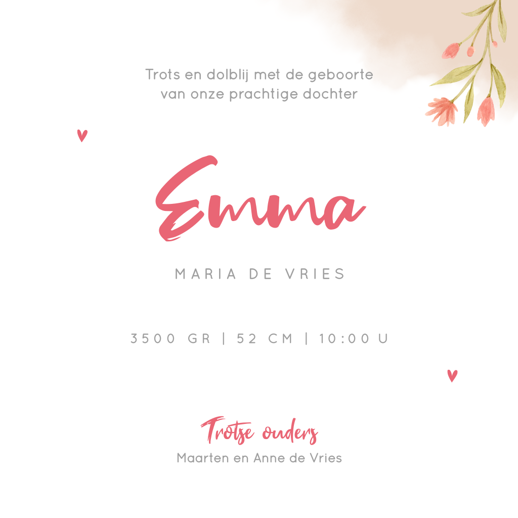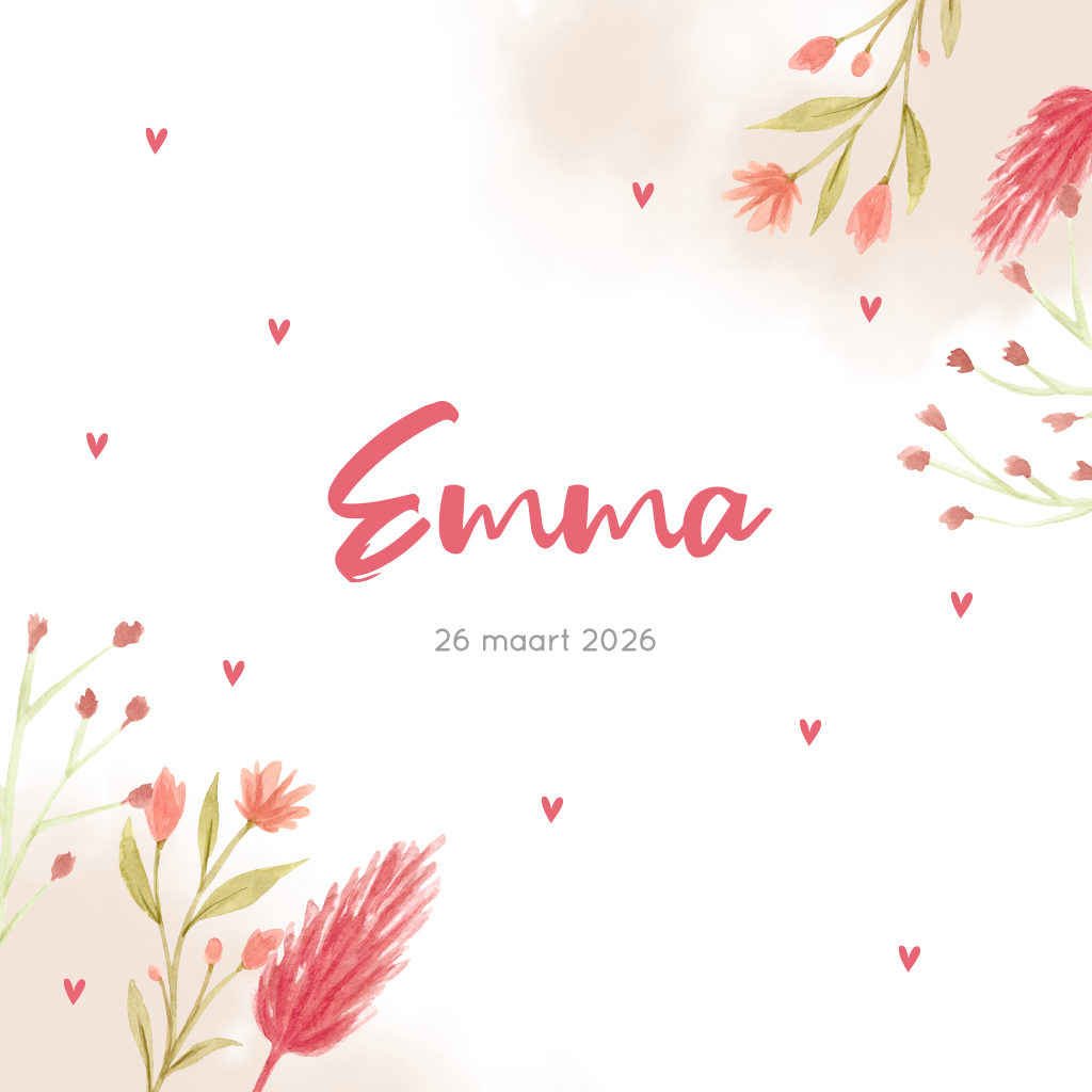 Lente geboortekaartje met roze bloemen en hartjes. Verwacht jij jouw kleine in de lente? Dan is dit geboortekaartje met schattige roze bloemetjes en zachte waterverf iets voor jou. De hartjes en de speelse typografie geven de kaart een vrolijk uiterlijk. Je kunt het ontwerp helemaal naar wens aanpassen in de ontwerptool. Tip, bestel een drukproef om jouw meisjeskaartje in het echt te beoordelen.
