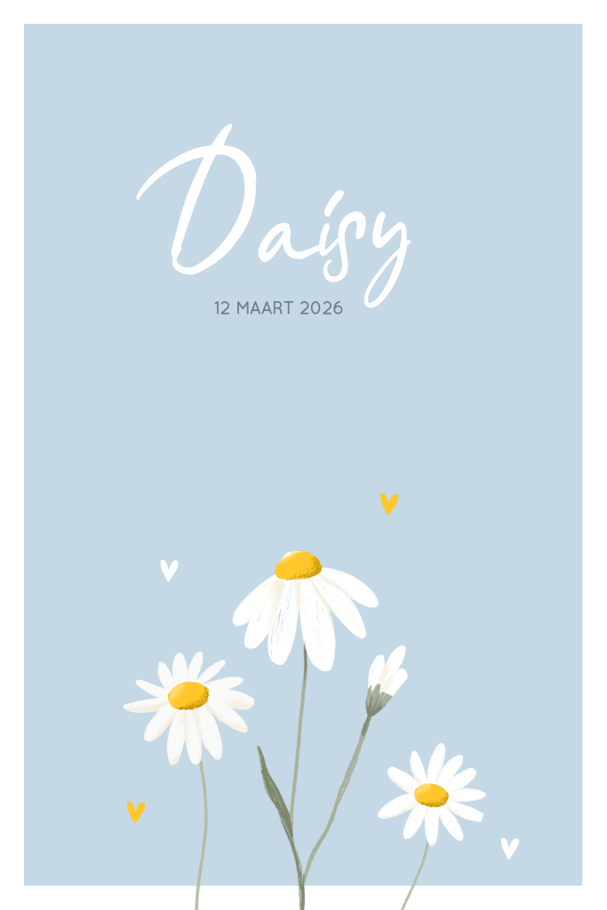 Lichtblauw geboortekaartje met getekende madeliefjes en hartjes. Op zoek naar een fris geboortekaartje voor de geboorte van jouw dochtertje? Wat dacht je van dit speelse ontwerp met witte madeliefjes. De kaart heeft een lichtblauwe achtergrond en is versierd met hartjes. Op de achterzijde keert de bloem terug en kun je de adres- en geboortegegevens kwijt. Geen fan van lichtblauw, je kunt de achtergrondkleur naar iedere kleur aanpassen.
