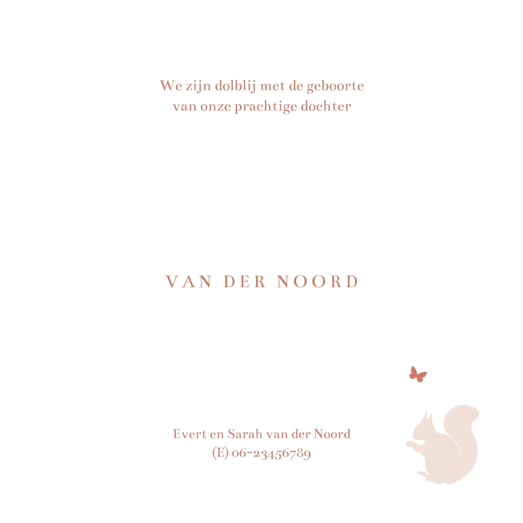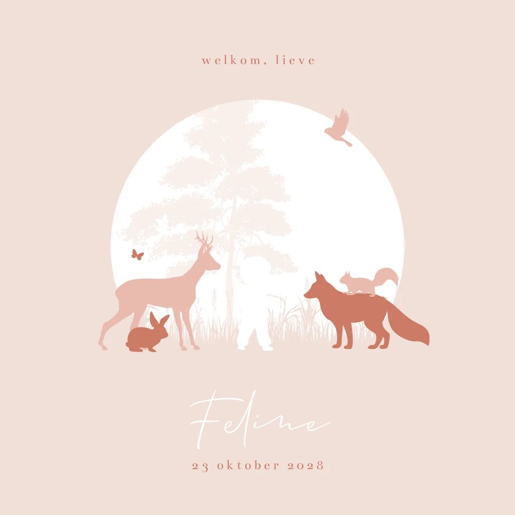 Wordt er in de herfst een meisje geboren? Kondig haar geboorte aan met dit prachtige koperfolie geboortekaartje. Op dit roze kaartje hebben we gekozen voor een betoverend tafereel, geïnspireerd door het serene bos. Tussen de bomen en naast een silhouet meisje staan nieuwsgierige bosdiertjes zoals een vos, hertje en eekhoorn. Een kleine vogel vliegt in de lucht, een symbool van vrijheid en nieuwe avonturen. Pas dit geboortekaartje met silhouetjes zelf aan in onze editor en bestel een proefdrukje.