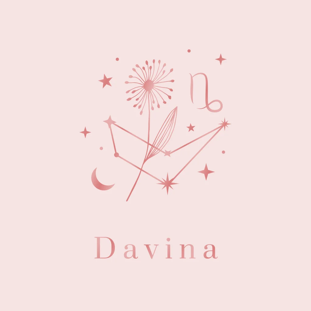 Lichtroze geboortekaartje met het sterrenbeeld Steenbok en de geboortebloem van je dochtertje. De illustratie en tekst worden in hoogglans gedrukt voor een elegant en bijzonder effect. Je vindt het sterrenbeeld in de map ‘Sterrenbeelden’ in onze editor om de kaart zelf te personaliseren.