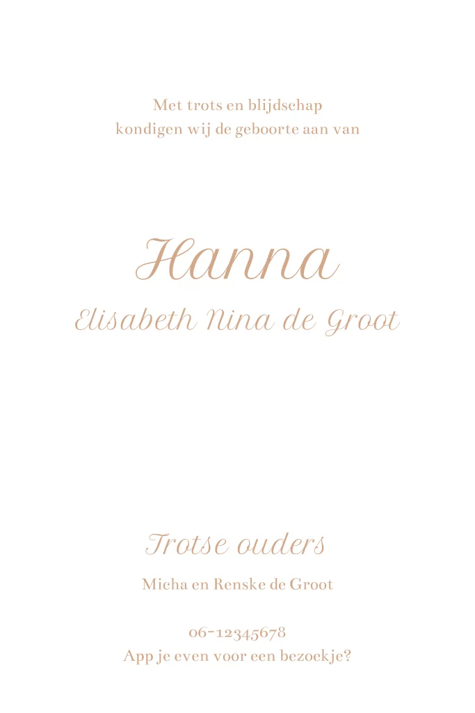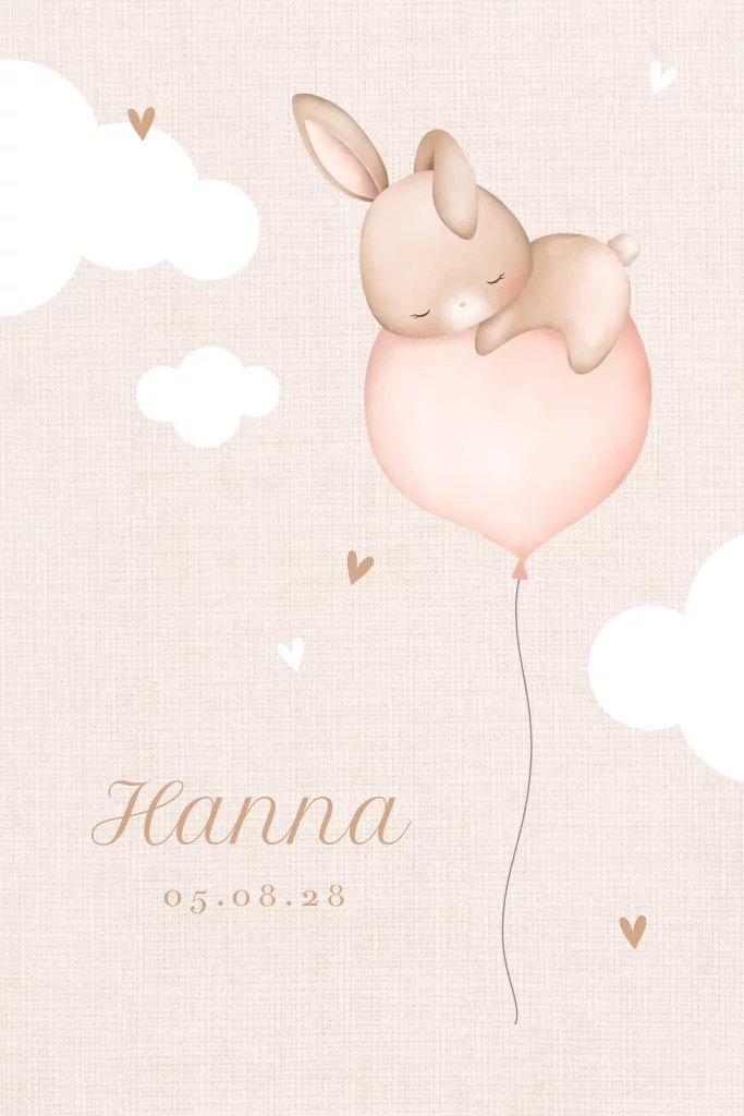 Op een roze ballon zweeft dit slapende, schattige konijntje tussen wolkjes en kleine hartjes. Een dromerig geboortekaartje om aan iedereen te laten weten: je hebt een dochtertje gekregen! Dit lieve ontwerp is zelf eenvoudig te personaliseren in onze handige editor. Bestel daarna een proefdruk om dit kaartje in het echt te kunnen bewonderen.
