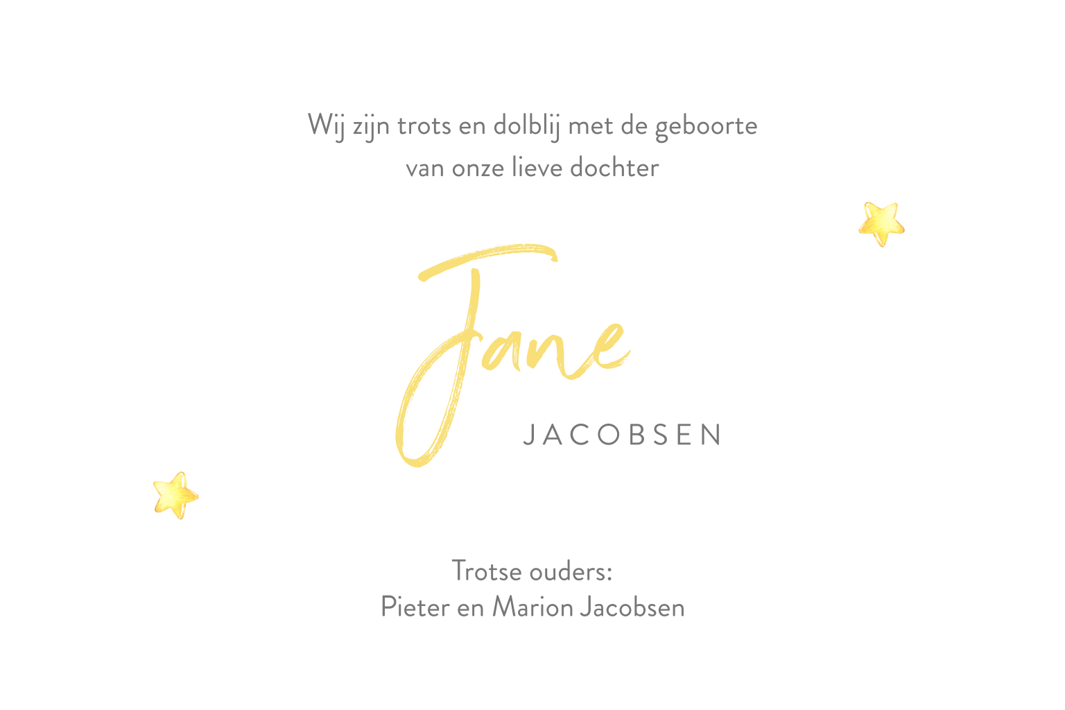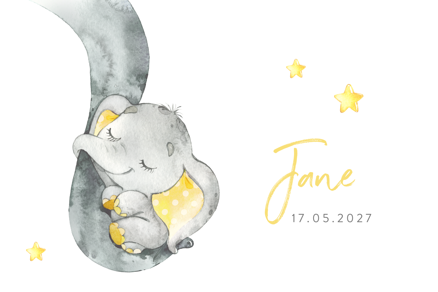 Dieren op geboortekaartjes zijn altijd eens schot in de roos. Hoe lief is dit geboortekaartje met baby olifant die op de slurf van haar moeder ligt te slapen. De kaart is versierd met gele sterren. Met een sierlijk lettertype staat de naam van je dochter voorop de kaart. In de kaart keert het baby olifantje terug en is er ruimte voor de geboortegegevens. Ben je blij met je ontwerp? Bestel een proefdruk en bekijk het gedrukte resultaat.