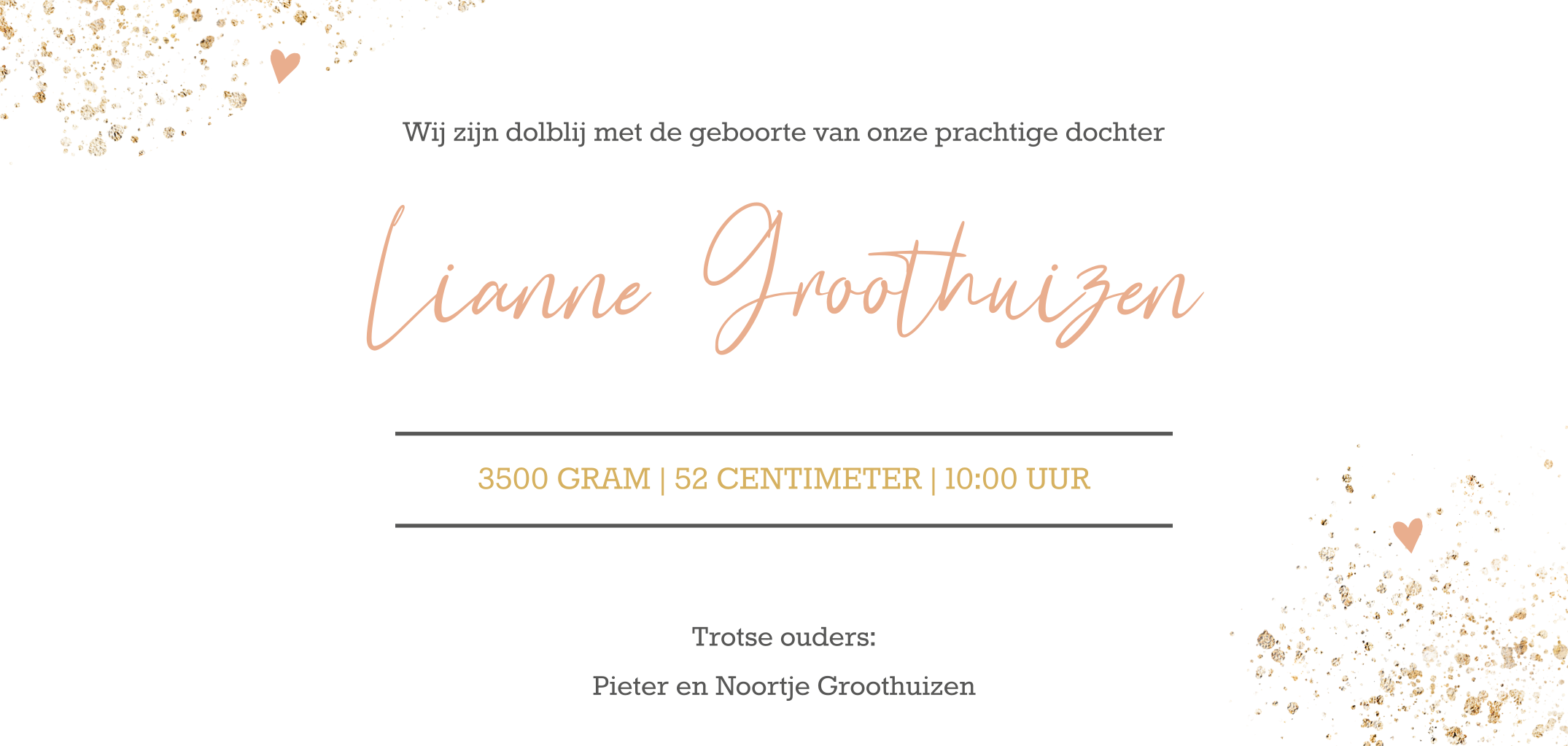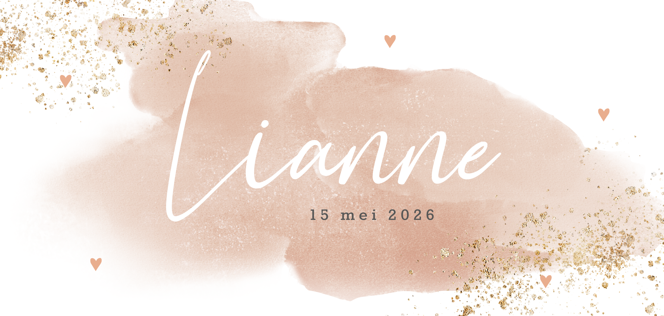 Een lief geboortekaartje met zachtroze waterverf en goudkleurige spetters. Met witte sierlijke typografie staat de naam van je dochtertje voorop de kaart. Aan de binnenzijde van dit ontwerp is er genoeg ruimte voor alle geboortegegevens van je dochtertje, maar ook voor een gedichtje of mooie zin. Ook verkrijgbaar in enkel formaat.