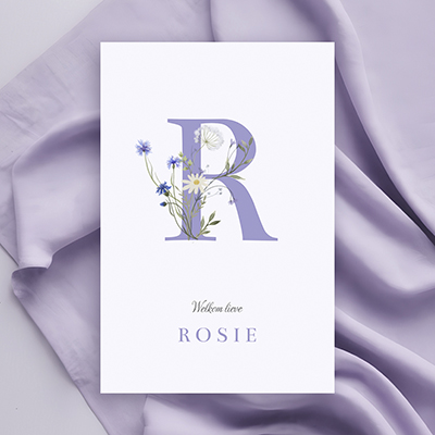 Hip geboortekaartje in lila en paars met initiaal van de 1e letter van de naam van je dochter. De letter is omgeven met wilde bloemen en planten. Bij de illustraties staat een map met 'bloemen wild' die je allemaal zelf kunt toevoegen tot jouw ontwerp perfect is. Maak de kaart naar wens en bestel een drukproef.