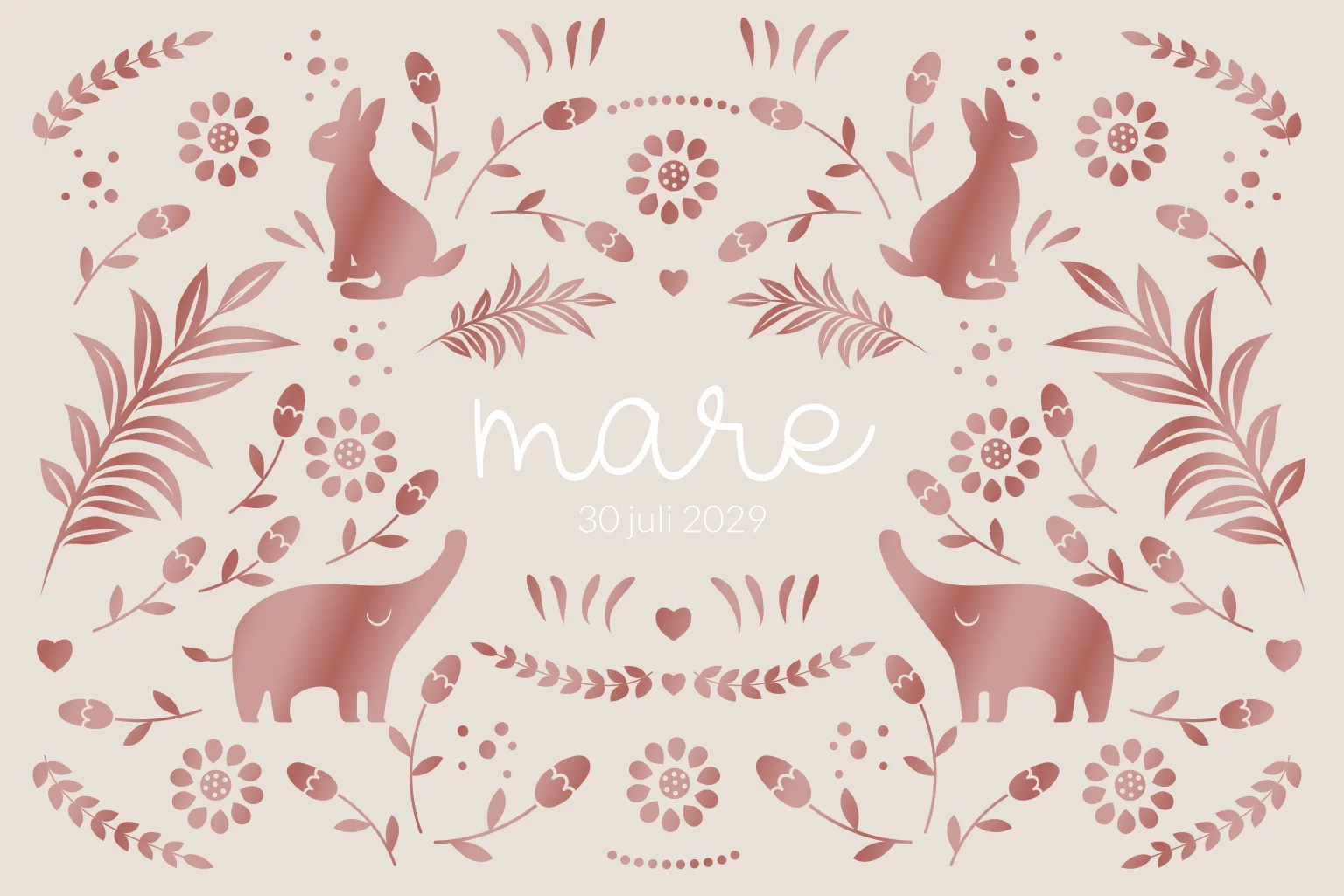 Meisje geboortekaartje bohemian met print konijn, olifant en bloemen