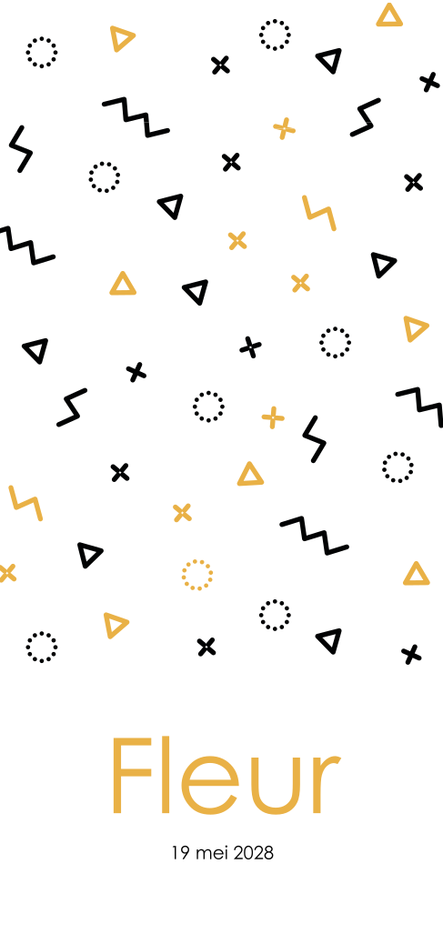 Vrolijk geboortekaartje voor een dochtertje met een hip memphis patroon van driehoekjes, rondjes, kruisjes en streepjes in zwart en okergeel.
