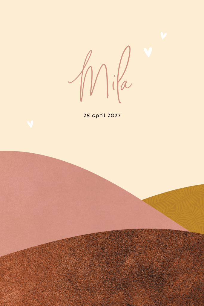 Een trendy geboortekaartje met minimalistische opmaak. Op de voorkant staan abstracte vormen die samen een landschap vormen. De subtiele texturen in de vormen geven dit kaartje wat meer diepte. In de okergele zit bijvoorbeeld een patroon van bladeren. De naam van je pasgeboren dochtertje komt in sierlijke typografie boven het landschap te staan.