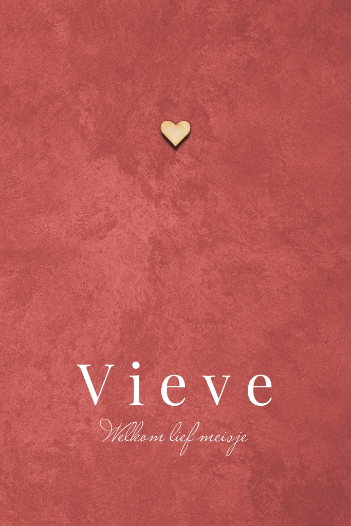 Eenvoudig, rozerood geboortekaartje met afgeronde hoeken en ruimte voor een klein, houten hartje. Je kunt deze houten vormpjes los bestellen en er zelf opplakken. Pas zelf de lettertypes en kleuren aan in onze handige editor.