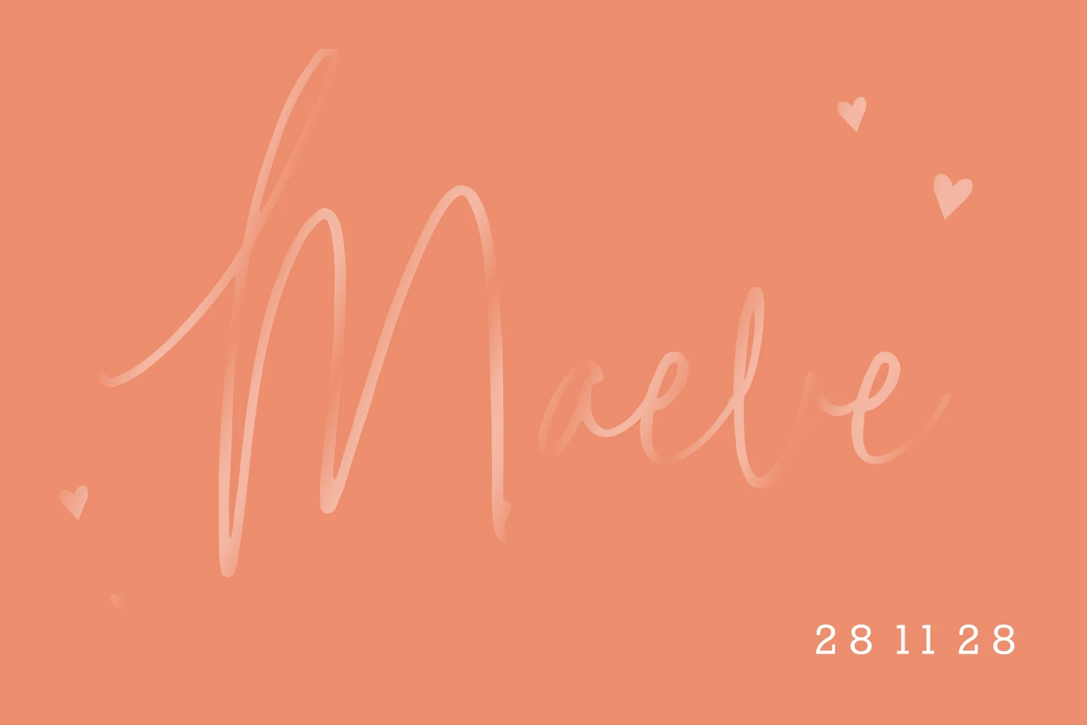 Minimalistisch zalmoranje geboortekaartje met hartjes en naam in hoogglans. De achtergrond en hoogglans elementen hebben dezelfde kleur, dit zorgt voor een heel bijzonder effect. Subtiel en chic! Aan de binnenkant kun je naam van je dochtertje terug laten komen. Pas de lettertypes zelf aan in onze handige tool.