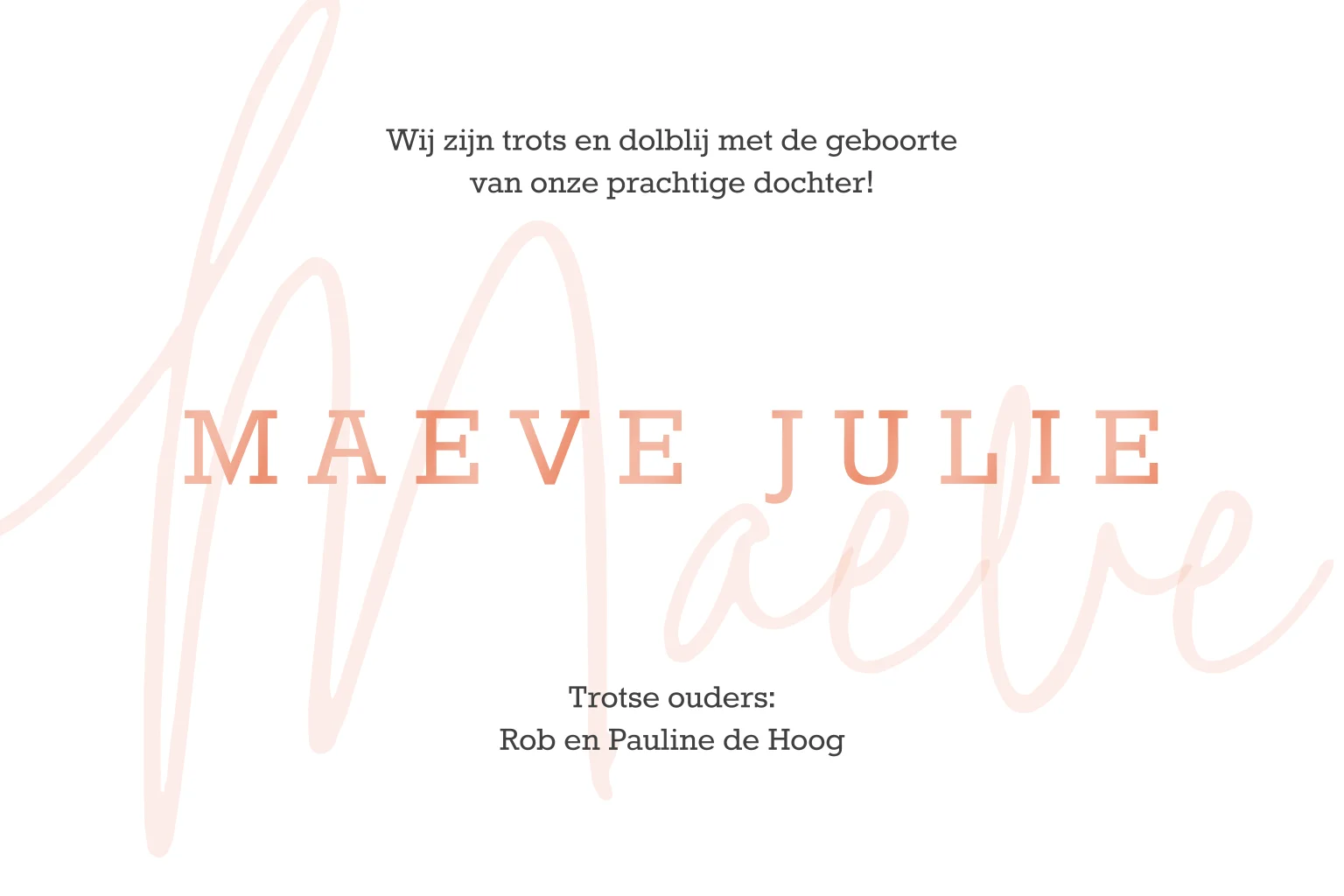 Monochroom zalmoranje geboortekaartje met naam in hoogglans
