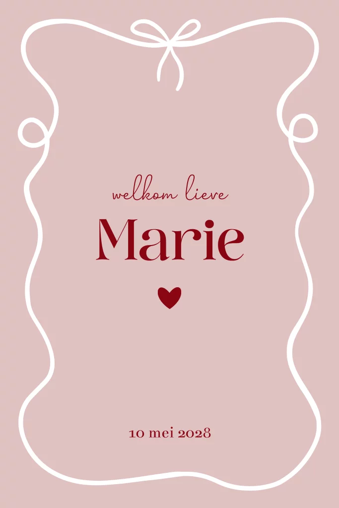 Een stijlvol geboortekaartje met een oudroze achtergrond en een sierlijk wit kader met strik. De naam staat centraal in een klassiek, maar modern lettertype, met een subtiel hartje eronder. Dit kaartje is volledig aanpasbaar in onze editor, en een proefdruk is mogelijk om het ontwerp in het echt te bekijken.