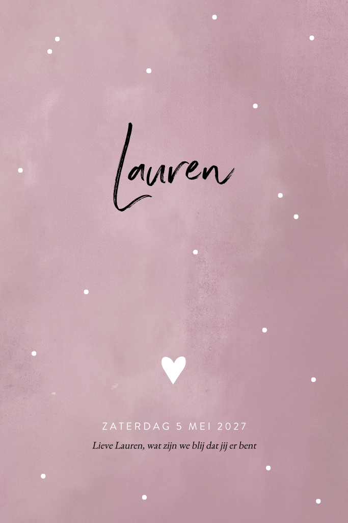 Staand oudroze geboortekaartje met stippen en wit hartje. De achtergrond is geschilderd met roze waterverf en is versierd met witte stipjes en een hartje. De naam van je pasgeboren dochter staat groot bovenaan de kaart met een trendy lettertype. Pas de kaart naar wens aan in de ontwerptool en bestel een proefdruk om het gedrukte resultaat te bekijken.