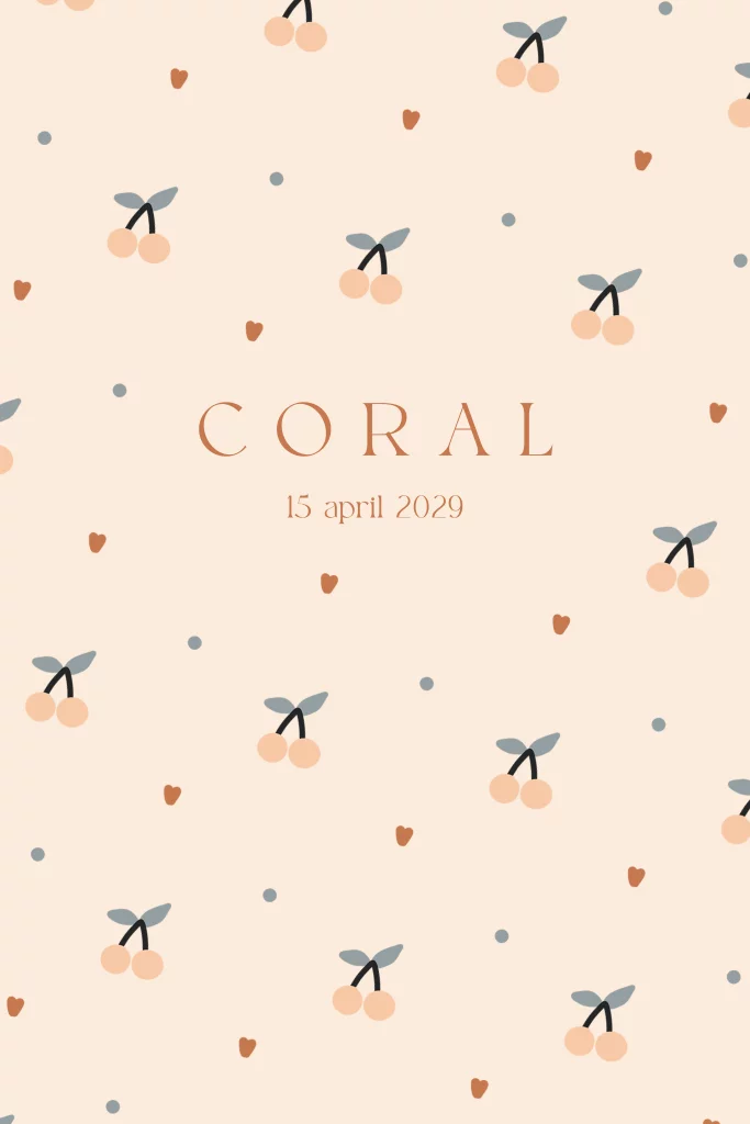Trendy geboortekaartje met een zacht perzikkleurig patroon van kersjes, stipjes en hartjes. De naam staat gecentreerd in een modern lettertype, met daaronder de geboortedatum. De combinatie van pasteltinten en een herhalend patroon geeft het kaartje een moderne, lieve uitstraling.