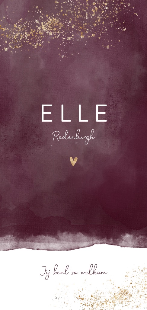 Stijlvol geboortekaartje met gouden spetters en donker rood paarse waterverf. Op zoek naar het mooiste geboortekaartje voor jouw pasgeboren dochter? Als je van chique ontwerpen houdt, dan is dit het ontwerp voor jou. De kaart heeft een donkere voorzijde geschilderd met donkerpaarse waterverf en is versierd met speelse spetters. Met een strak lettertype staat de naam op de voorzijde. In de ontwerptool maak je het kaartje helemaal naar wens.