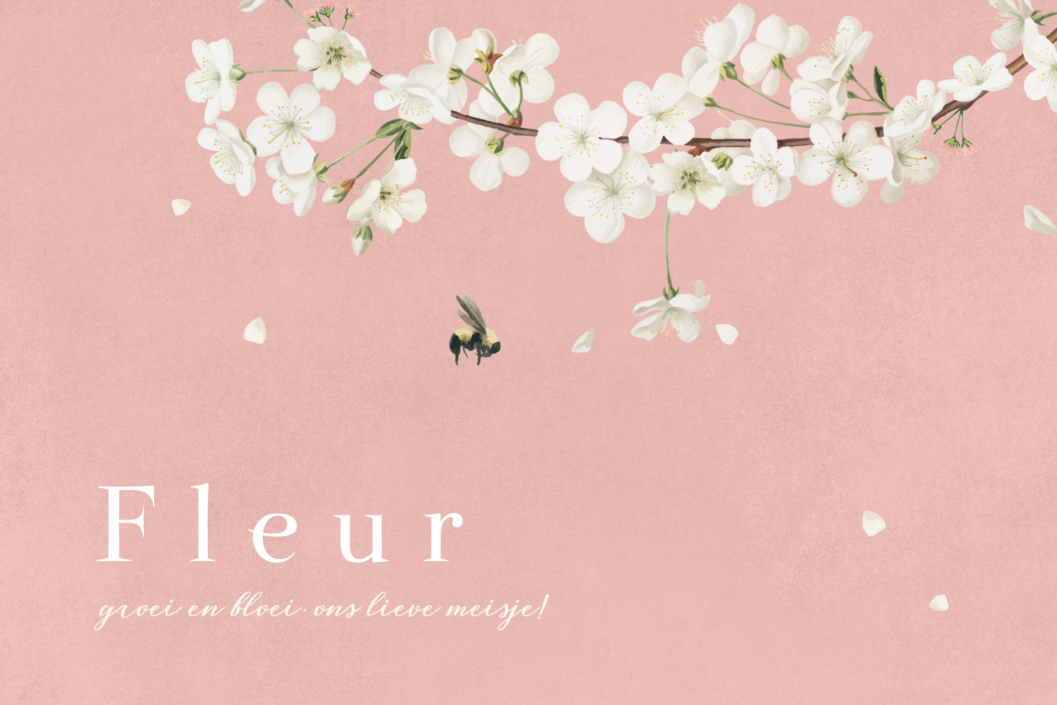 Roze geboortekaartje met bloesem en bijtje