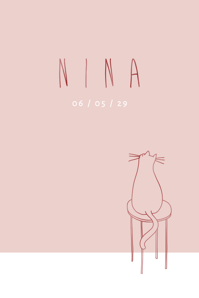 Vrolijk geboortekaartje met getekende kat op een krukje in donkerrode hoogglans. De achtergrond is zachtroze, maar deze kun je natuurlijk zelf aanpassen in onze handige editor. Op de achterkant van dit enkele ontwerp komt de kat terug en is er ruimte voor alle geboortegegevens van je dochtertje. Bestel een proefdrukje van dit leuke, hoogglans geboortekaartje om deze in het echt te kunnen bewonderen.