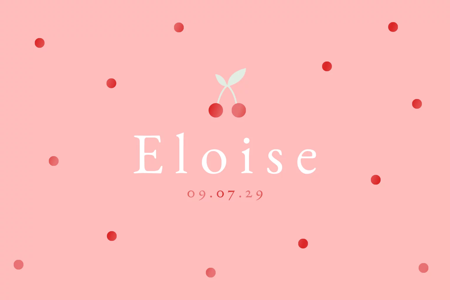 Lieflijk geboortekaartje in roze kleur met hoogglans kersjes en polkadots. Een vrolijk kaartje om de komst van je pasgeboren dochtertje mee aan te kondigen. De rode stipjes en kersjes op de voorzijde krijgen een glimmend hoogglans laagje en springen dus van het papier af. Pas de kleuren en lettertypes eventueel aan in onze handige editor en bestel een proefdruk.