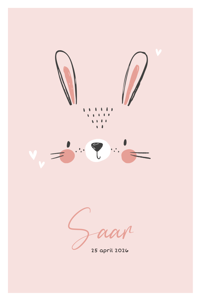 Roze, staand geboortekaartje met illustratie konijntje. Op zoek naar een lief geboortekaartje voor je pasgeboren kindje? Wat dacht je van dit hippe, roze geboortekaartje op staand, enkel ontwerp. In het midden van de kaart zie je een lieve illustratie van een schattig konijntje met roze oortjes en wangen. Onderaan de kaart staat de naam met een hip lettertype. Op de achterzijde is ruimte voor alle overige informatie. Denk aan adres- en geboortegegevens, een eventuele kraamborrel en een persoonlijk tekstje.
