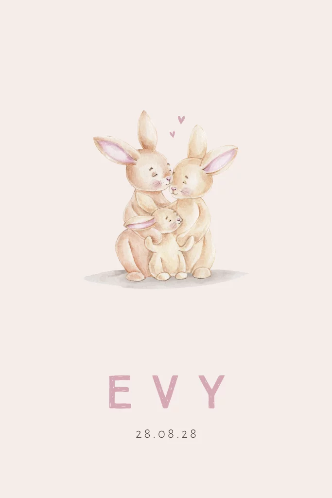 Wat een lief geboortekaartje met konijnenfamilie! Vader en moeder konijn met tussen hun in het baby konijntje. Pas dit kaartje met drie schattige konijntjes zelf naar eigen wens aan in onze handige ontwerptool. De zachte pastelkleuren en de minimalistische stijl zorgen voor een tijdloos en lief ontwerp.