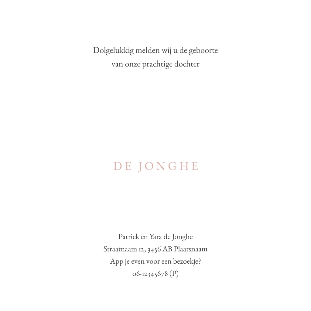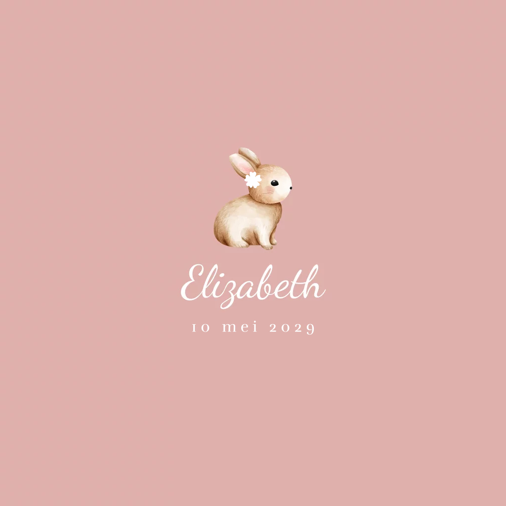 Goudfolie geboortekaartje met schattig konijntje met een gouden bloemetje. De naam van je dochtertje komt in sierlijke letters onder het konijntje. Aan de binnenzijde is genoeg ruimte voor alle gegevens. Pas dit kaartje naar eigen wens aan in onze editor.