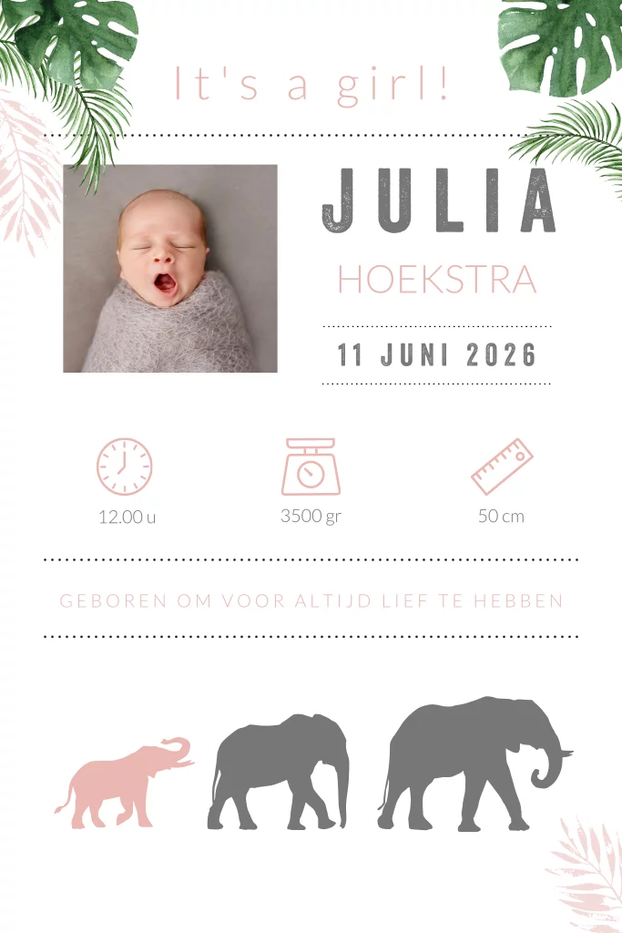 Geboortekaartje met typografie en olifantjes en een eigen foto. Een hip enkel geboortekaartje met stoere en speelse typografie. De kaart krijgt een tropische uitstraling door de vrolijke bladeren. Onderaan het kaartje lopen drie olifantjes, de laatste heeft een roze kleur. Maar deze kun je natuurlijk ook van kleur veranderen. Ook is er nog ruimte voor een leuke foto van je dochtertje. Bewerk de kaart met de editor en bestel een drukproef.