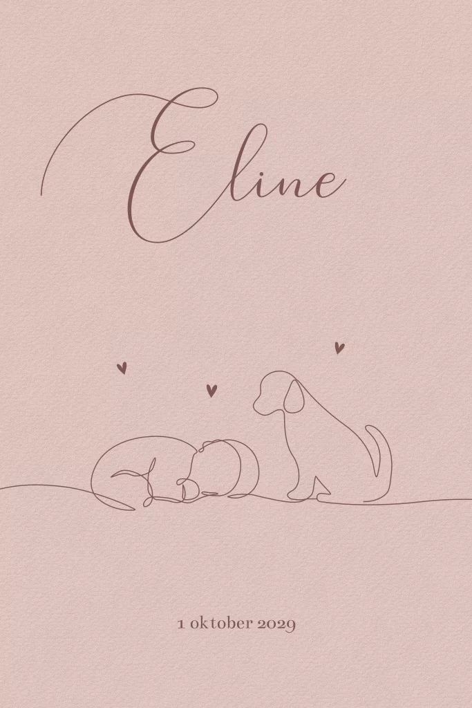 Zacht en stijlvol geboortekaartje in roze, speciaal voor een meisje. Dit enkel staande kaartje heeft een minimalistisch ontwerp met een lijntekening van een slapende baby met een hondje ernaast. De naam Eline staat sierlijk bovenaan, terwijl de geboortedatum subtiel onderaan is geplaatst. Beide teksten en kleuren zijn volledig aan te passen in de editor.