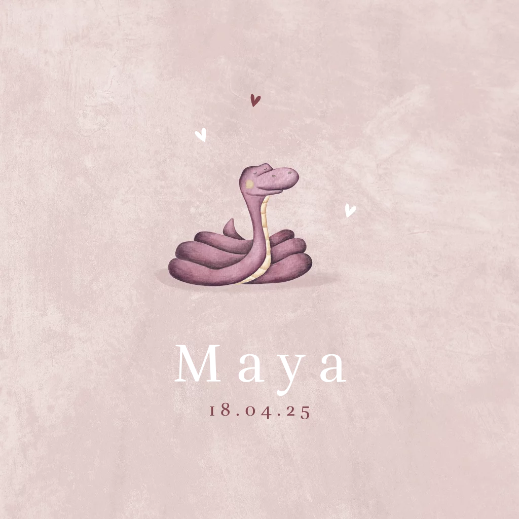 Vier de komst van je kleine meisje met dit unieke geboortekaartje, geïnspireerd door het jaar van de Slang volgens de Chinese dierenriem. De slang symboliseert wijsheid, intuïtie en gratie – eigenschappen die je dochter met zich mee zal dragen. Het zachte en lieve ontwerp in roze met de naam in roségoudfolie maakt het kaartje extra bijzonder.