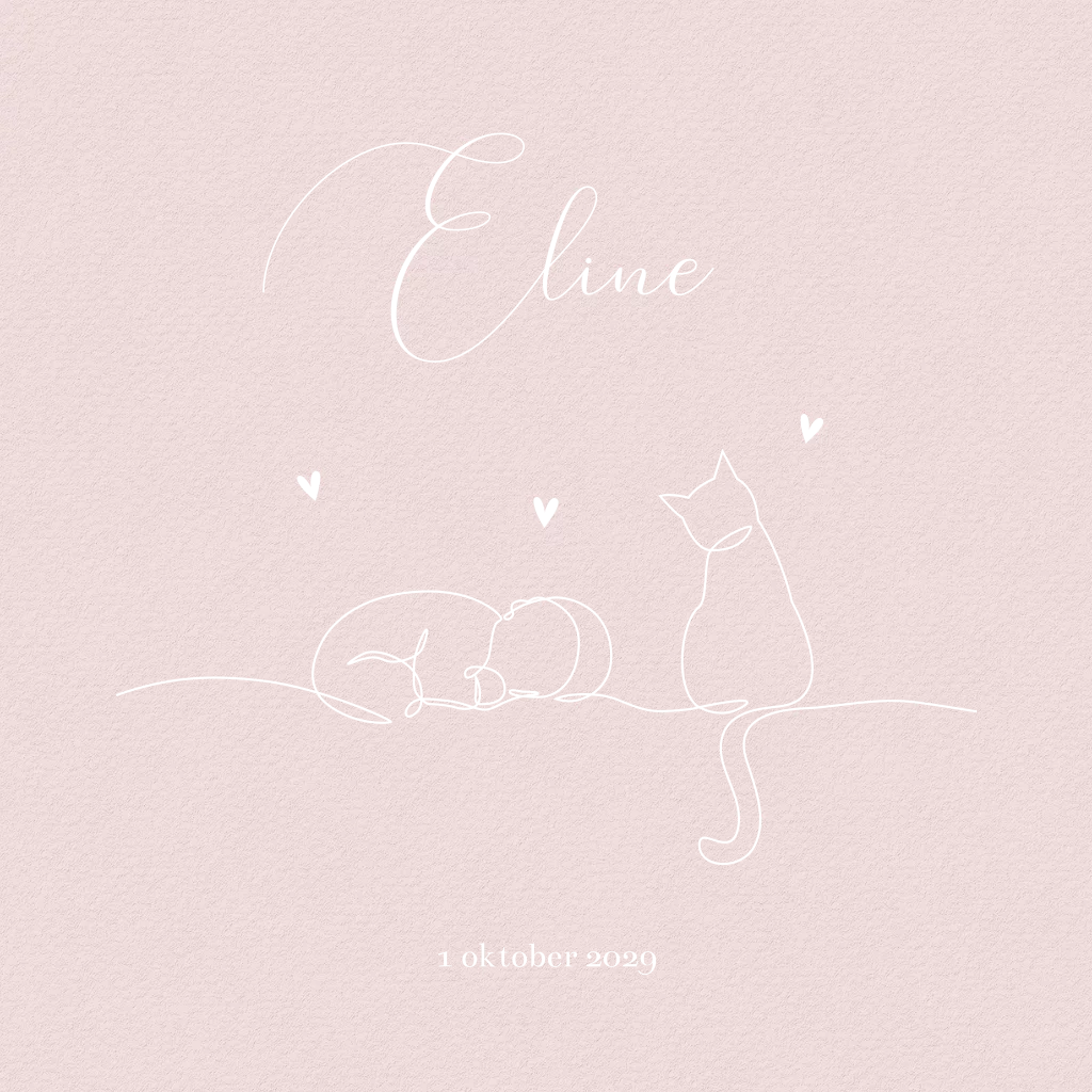 Schattig geboortekaartje voor een meisje met een zachtroze achtergrond en een one line drawing van een liggend baby meisje met kat. De vierkante, dubbelgevouwen kaart heeft afgeronde hoeken (dit kun je in de editor aanpassen). De naam staat boven de illustratie in een sierlijk lettertype, de geboortedatum onderaan, beide in roségoudfolie. Extra leuk voor kattenliefhebbers. Het kaartje is volledig te personaliseren in de editor met jullie eigen gegevens.