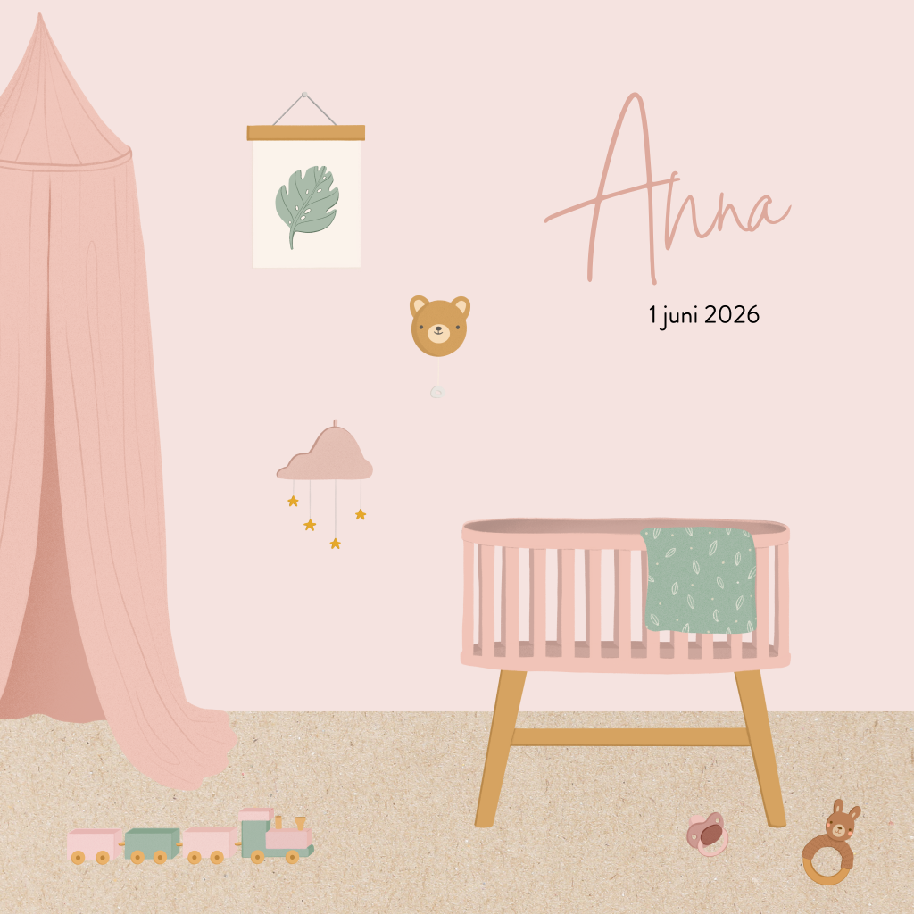 Roze geboortekaartje meisje met wieg in kinderkamer