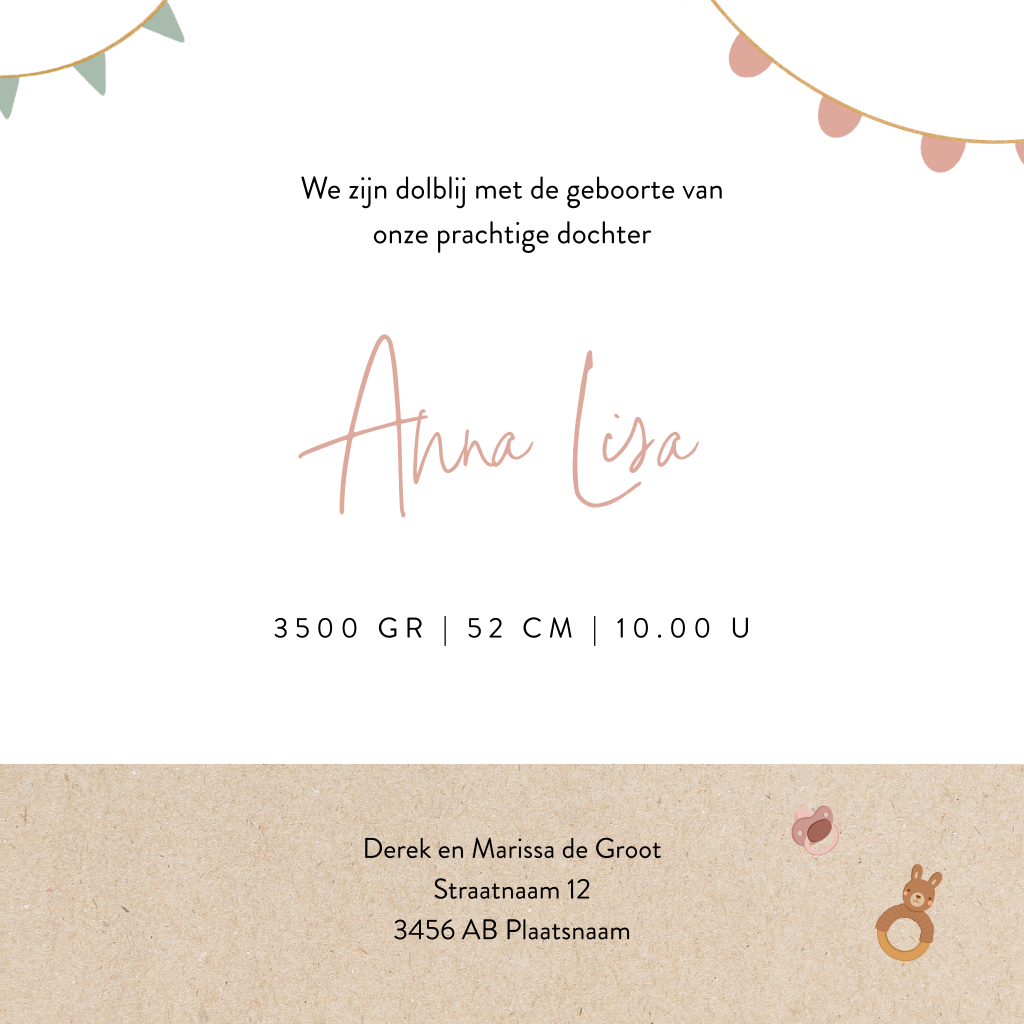 Een schattig geboortekaartje met een getekend kinderkamertje met wieg, hemeltje en speelgoed. Met de illustraties in onze ontwerptool kun je dit unieke meisjeskaartje zelf aanpassen, bijvoorbeeld in de stijl van de babykamer van je pasgeboren dochtertje. Voeg bijvoorbeeld een muziekdoosje, een plankje met print of kleertjes toe of verschuif de huidige afbeeldingen. Aan de binnenkant komen de illustraties terug. Klaar met spelen in onze ontwerptool en benieuwd naar het eindresultaat? Bestel dan een proefdruk.