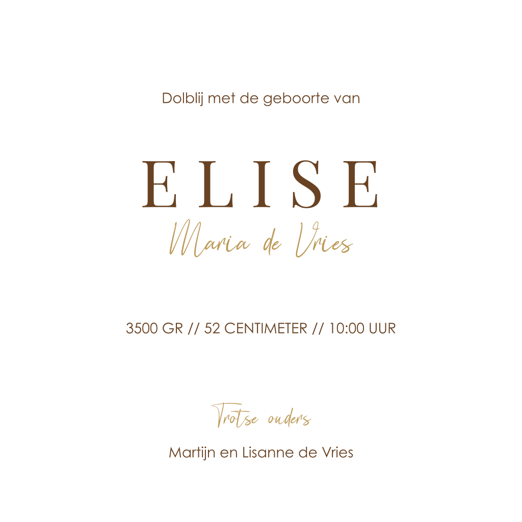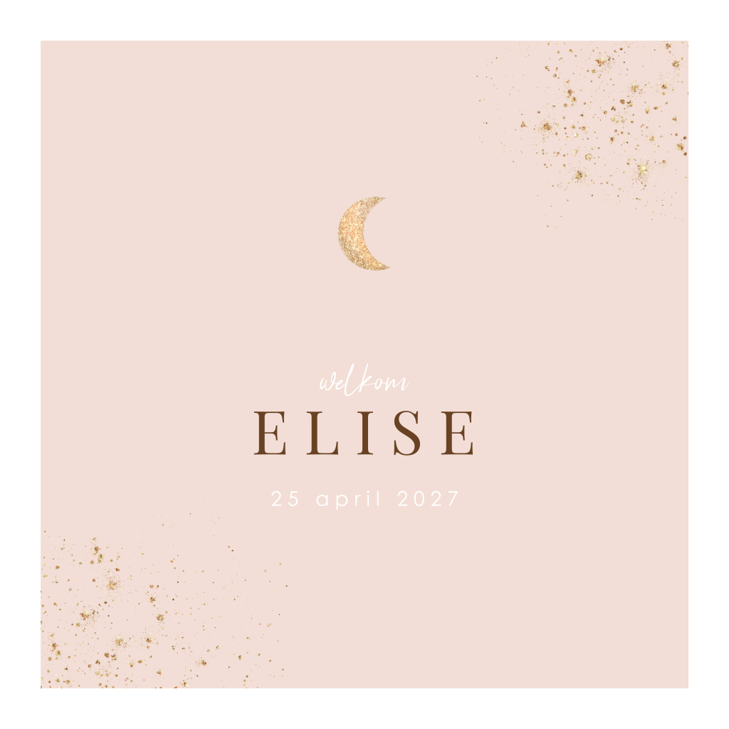 Roze geboortekaartje met spetters en goudkleurig maantje om de geboorte van een meisje aan te kondigen. Echt een lief geboortekaartje met zachte uitstraling. De kaart heeft een roze achtergrond en is versierd met goudkleurige spetters en een maan. Stijlvolle en sierlijke typografie wisselen elkaar af. Liever een wat speelser lettertype? Dat kan natuurlijk. Je kunt deze kaart makkelijk eigen maken in de ontwerptool. Zo kun je de achtergrond veranderen en de teksten wijzigen.