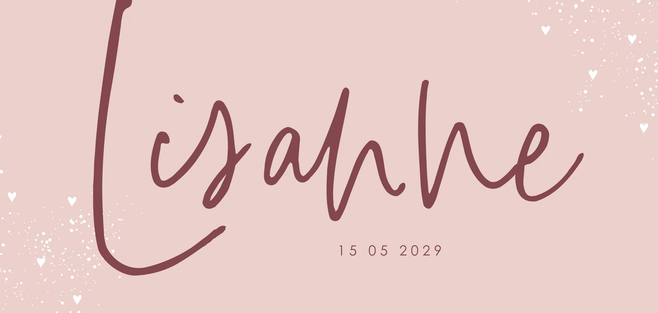 Dit roze geboortekaartje heeft niet veel nodig om stijlvol te zijn. De dieprode letters van de naam kleuren mooi met de zachtroze achtergrond. Met grote sierlijke letters staat de naam van jullie dochter voorop de kaart. In de hoeken zie je witte spetters en hartjes.