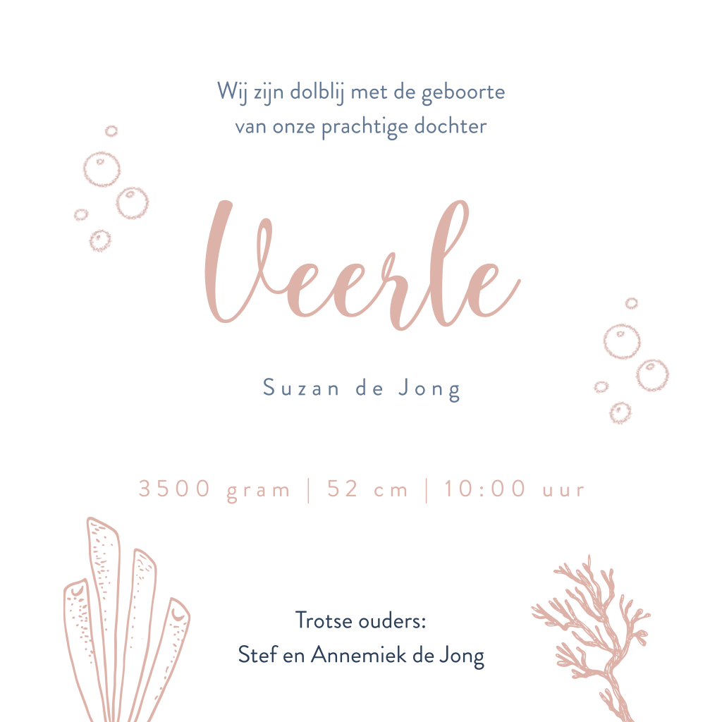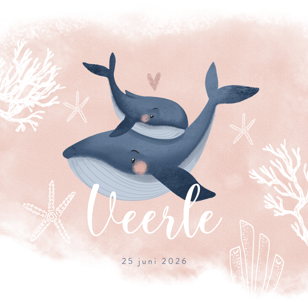 Roze geboortekaartje met baby walvis in de onderwaterwereld voor een meisje. Ook zo'n fan van het onderwater thema? Dan is dit geïllustreerde babykaartje misschien wel wat voor jouw pasgeboren dochtertje. Dit roze ontwerp heeft een mooie illustratie van twee walvissen voorop. De kaart wordt versierd met zeewier en onderwater plantjes. Pas het ontwerp naar wens aan en bestel een drukproef.