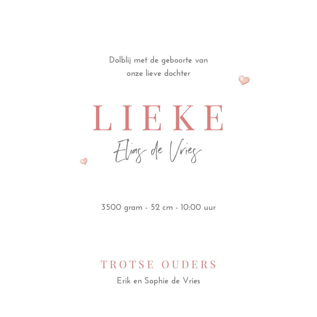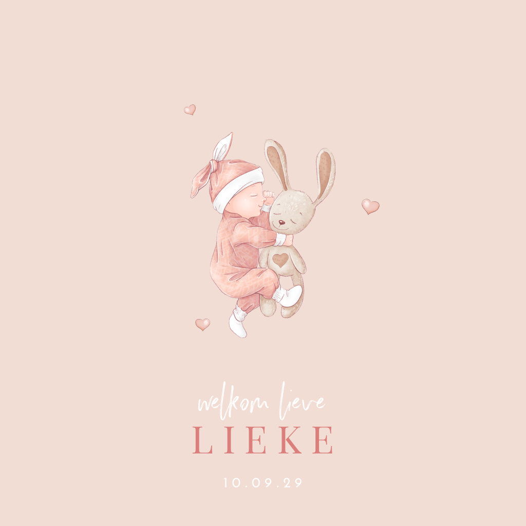 Zacht geboortekaartje met een prachtige tekening van een vredig slapende baby, gekleed in een teder roze pakje en muts. Het pasgeboren meisje rust op haar zij en omarmt een liefdevolle knuffel (een konijn) in haar kleine armpjes. Deze ontroerende scène wordt omlijst door hartjes op een subtiel roze achtergrond. Gebruik onze handige editor om het kaartje moeiteloos aan te passen aan je eigen voorkeur en vraag gerust een drukproef aan voor een resultaat dat perfect is.