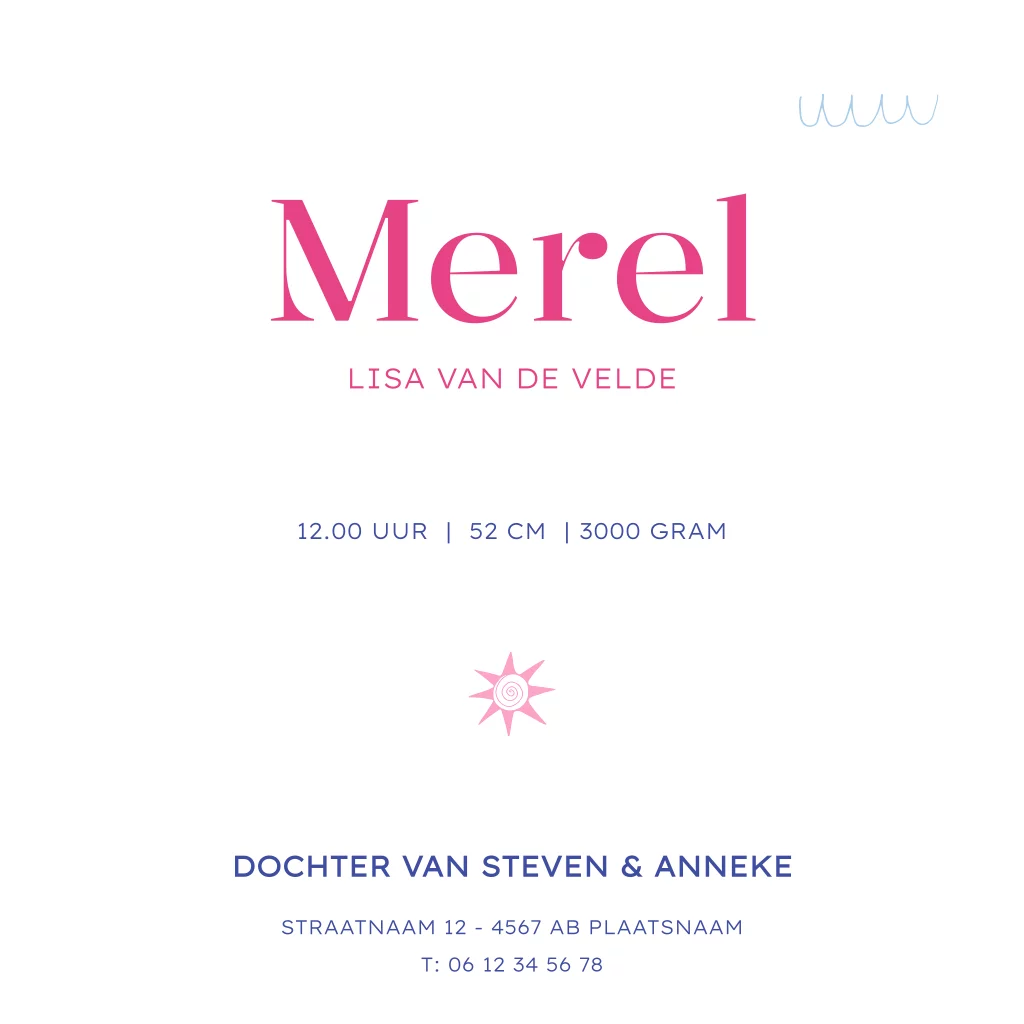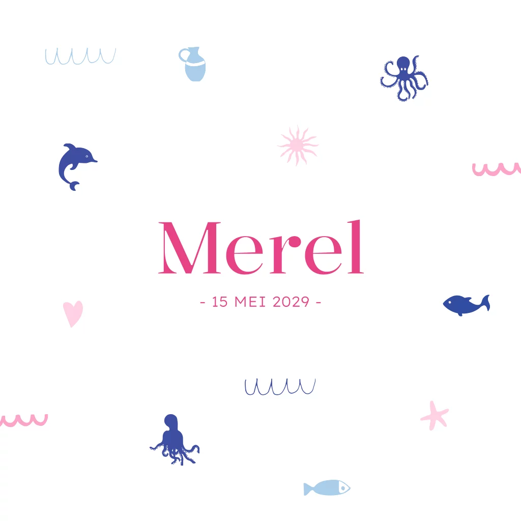 Welkom in de onderwaterwereld van onze kleine meid! Lief geboortekaartje vol met kleine zeewezens zoals een visje, dolfijn en een octopus, omringd door golfjes en schelpjes. Maak het kaartje helemaal naar jouw wens en laat een proefdruk maken om het resultaat alvast kunt zien. Zo ben je helemaal voorbereid op de komst van je kleintje.