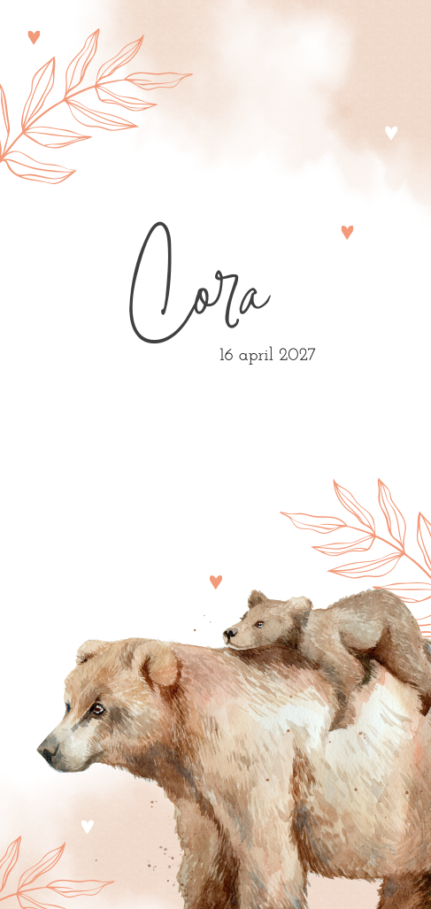 Roze geboortekaartje met lieve illustratie van beertjes. Op de voorzijde zie je een mooie illustratie van een moederbeer met haar jong op haar rug. De kaart wordt gedecoreerd door bladeren, waterverf en hartjes. Pas de kleuren, lettertypes en teksten naar wens aan om het kaartje te personaliseren.