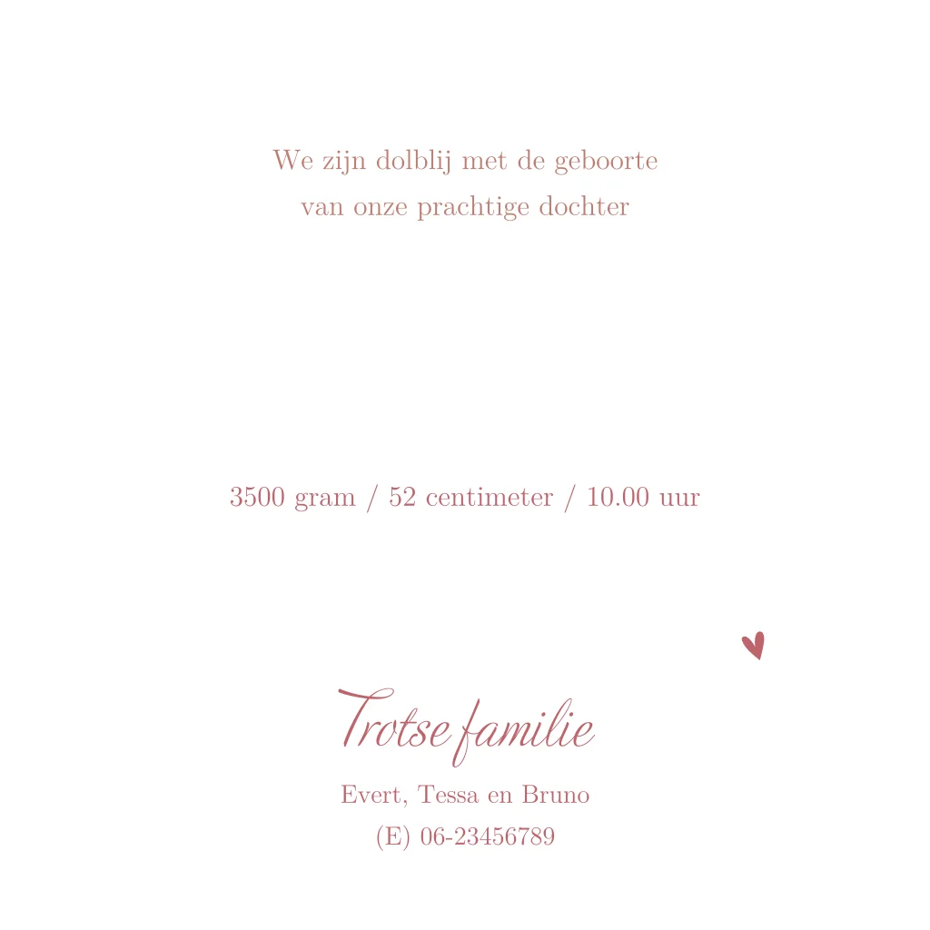 Op zoek naar een lieve geboortekaart voor je aanstaande dochter met een hondje erop? Ga voor dit roze ontwerp met silhouetjes van een baby en hond in roségoudfolie. De spetters, hartjes en waterverf versieren de rest van de kaart. Aan de binnenzijde van dit vierkante kaartje kun je een mooie foto en de geboortegegevens van je dochtertje plaatsen. Pas dit geboortekaartje met silhouetjes zelf aan in onze editor en bestel een proefdrukje.