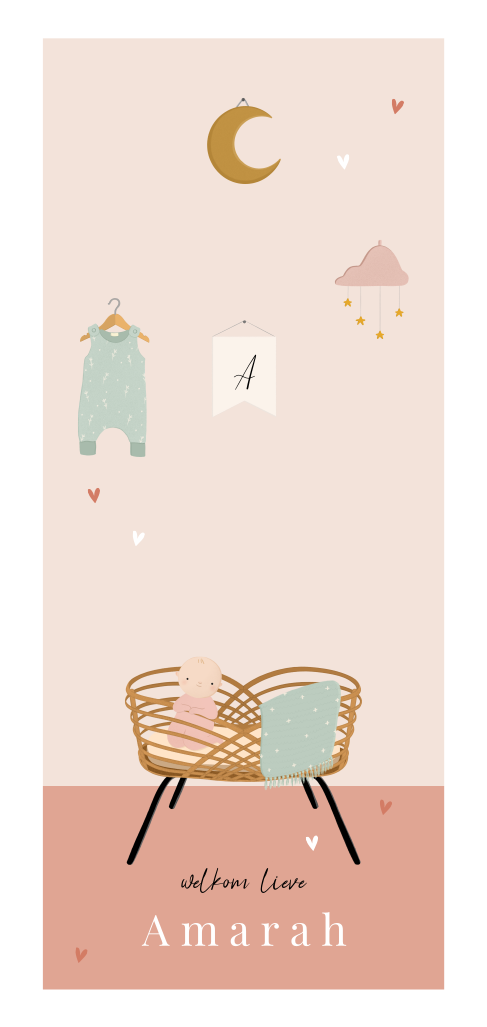 Op dit langwerpige, roze geboortekaartje staat een illustratie van een hip rotan wiegje met een baby erin. Boven het wiegje hangt een groen pakje en een plankje met regenboog en print aan de muur. Op het printje kun je zelf het initiaal van je pasgeboren dochtertje plaatsen. In onze ontwerptool kun je bijpassende illustraties (o.a. ook kindjes met een andere huidskleur) vinden in de afbeeldingen map 'Kinderkamer'. Pas het ontwerp naar eigen smaak aan en bestel jouw mooie aangepaste proefdruk met jullie gekozen naam.