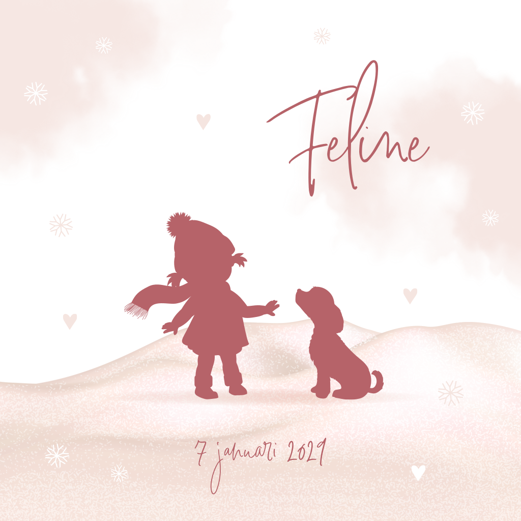 Roze geboortekaartje met silhouet meisje met hond in de sneeuw