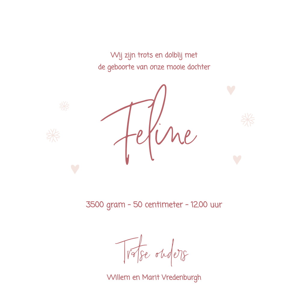 Een lief geboortekaartje voor een winterkindje. Op de voorkant van dit vierkante kaartje staat silhouetjes van een meisje met haar hondje in de sneeuw. In de kaart keert het meisje terug, met daarboven ruimte voor een lieve tekst. Rechts is ruimte voor alle geboortegegevens van je dochtertje. Pas deze kaart naar eigen wens aan in onze handige ontwerptool.