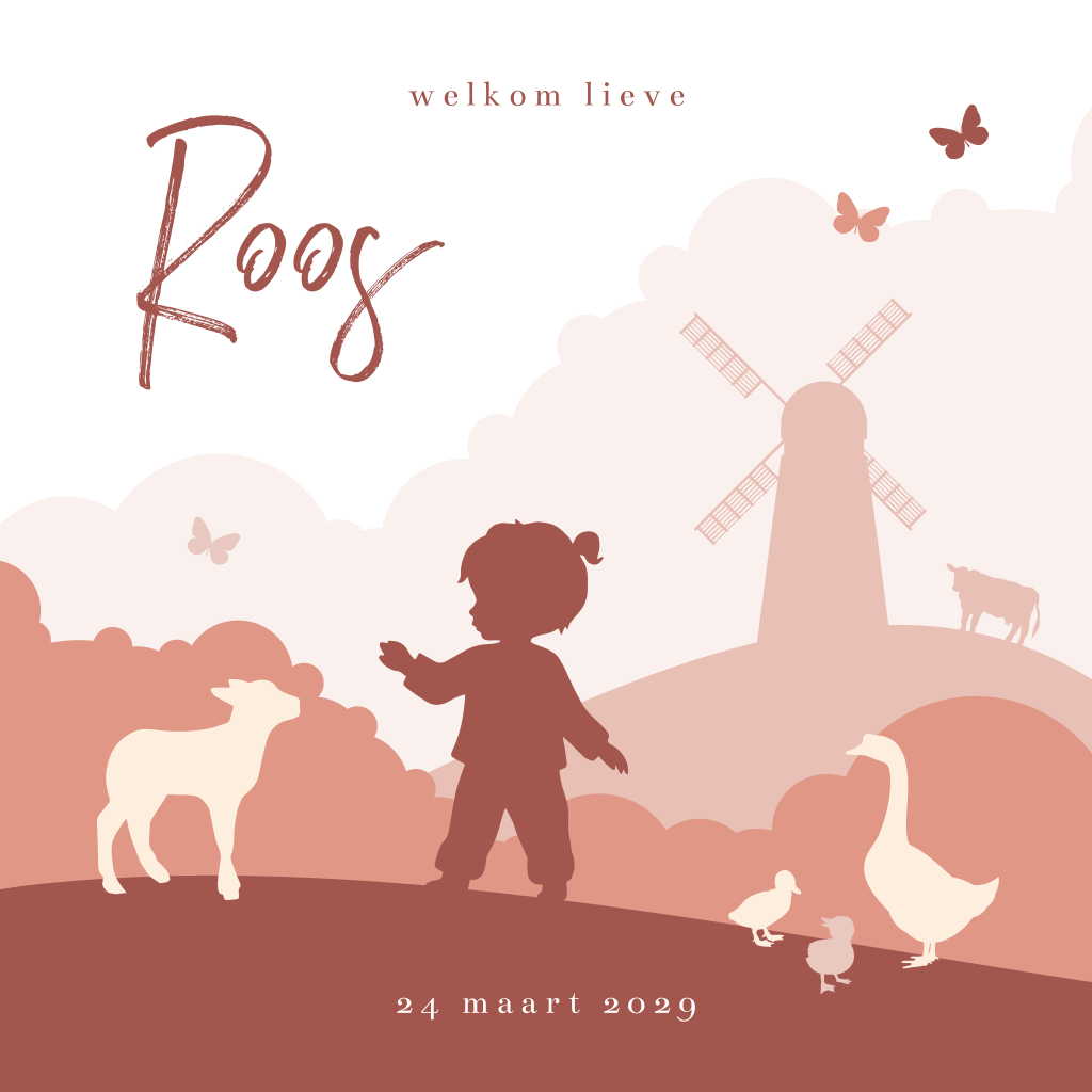 Op zoek naar een geboortekaartje voor je aanstaande dochtertje met een boerderij of Hollands thema? Ga voor dit rood met roze ontwerp met silhouet meisje, een lammetje, gansjes en een molen. Een vrolijk kaartje dat volledig zelf te personaliseren is in onze handige editor.