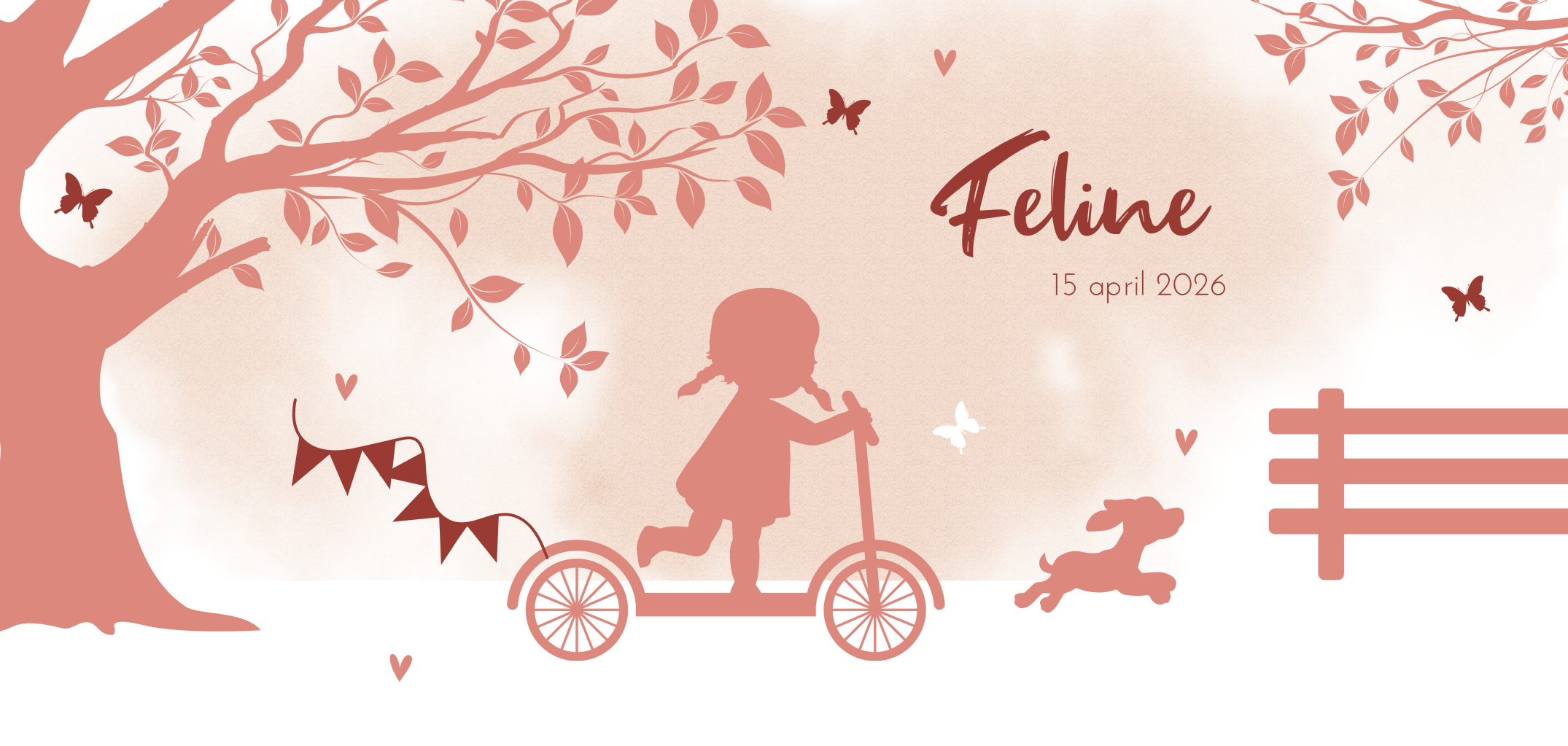 Roze silhouet geboortekaartje met meisje op step. Verwacht jij jouw dochtertje in de lente? Kies voor dit vrolijke ontwerp met een silhouet van een meisje op de step. Achter de step wappert een slinger. De vlinders en hartjes zorgen voor een speels effect. Je kunt dit kaartje helemaal naar wens aanpassen door de kleuren en lettertypes aan te passen. Bestel een drukproef en bekijk de kaart in het echt.