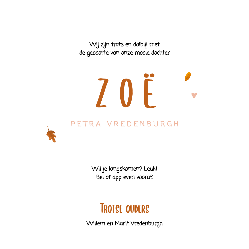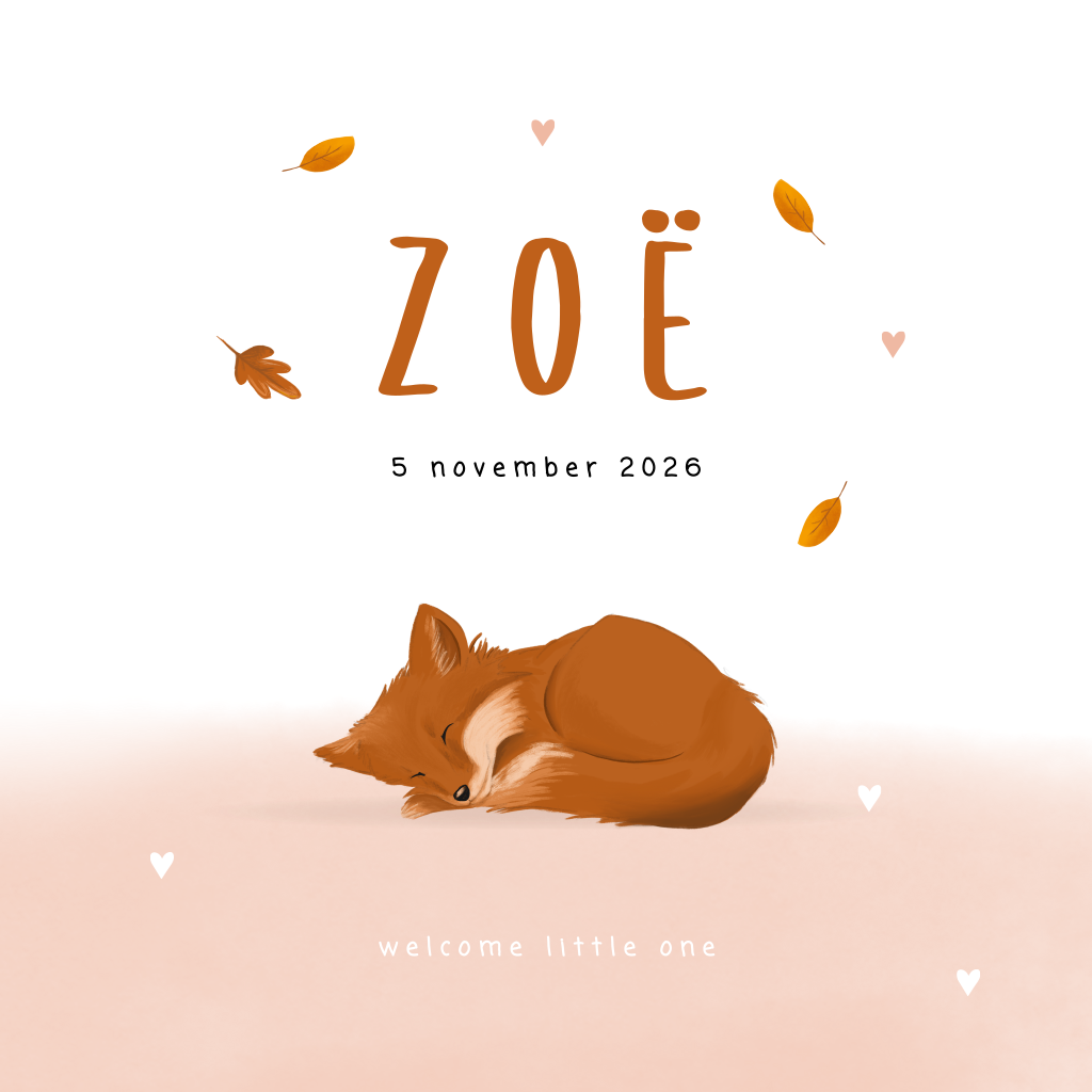 Roze geboortekaartje met slapend vosje en herfstblaadjes. Getekend geboortekaartje met een lieve illustratie van een vosje dat ligt te slapen. De achtergrond bestaat uit waterverf in de kleur blush. Rondom het beestje dwarrelen herfstblaadjes en kleine hartjes. Pas de teksten en lettertypes naar wens aan en bestel een drukproef. Tip, op structuurpapier lijkt de waterverf nog realistischer.