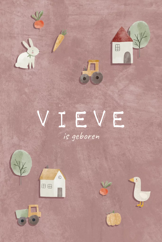Deze schattige geboortekaart met een landelijke uitstraling is perfect voor het aankondigen van de geboorte van je dochter. De zachtroze kaart met illustraties van boerderijdieren zoals een konijn, gans, samen met andere vrolijke tekeningetjes als wortels, bomen, huis, schuur en een tractor. De speelse en handgetekende stijl geeft de kaart een lieve sfeer. Deze geboortekaart is volledig aanpasbaar met onze online editor. Ben je klaar? bestel dan een drukproef.