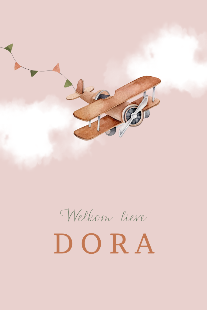 Ben je op zoek naar een leuk geboortekaartje om de geboorte van je dochter aan te kondigen? Kies dan voor dit lichtroze geboortekaartje met een waterverf illustratie van een bruin vliegtuigje met slingers erachter. Je kunt de kaart zelf nog verder aanpassen met de designtool.