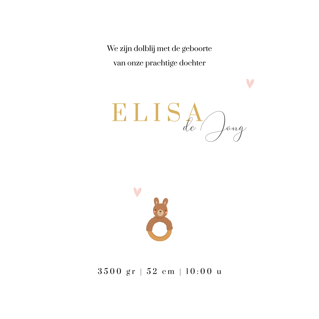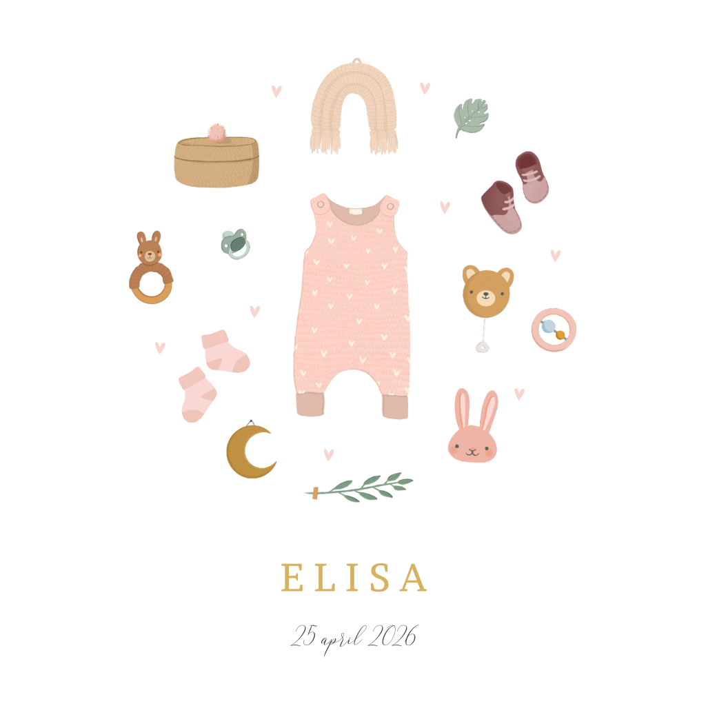 Getekend hip geboortekaartje met roze speelgoed en babykleding in een cirkel. Op zoek naar een stijlvol geboortekaartje met lieve illustraties? Zoek niet verder, dit leuke geboortekaartje heeft een cirkel vol babyspullen op de voorkant, waaronder een lief pakje, een speentje en een rammelaar! Pas de lettertypes naar wens aan en bestel een drukproef.