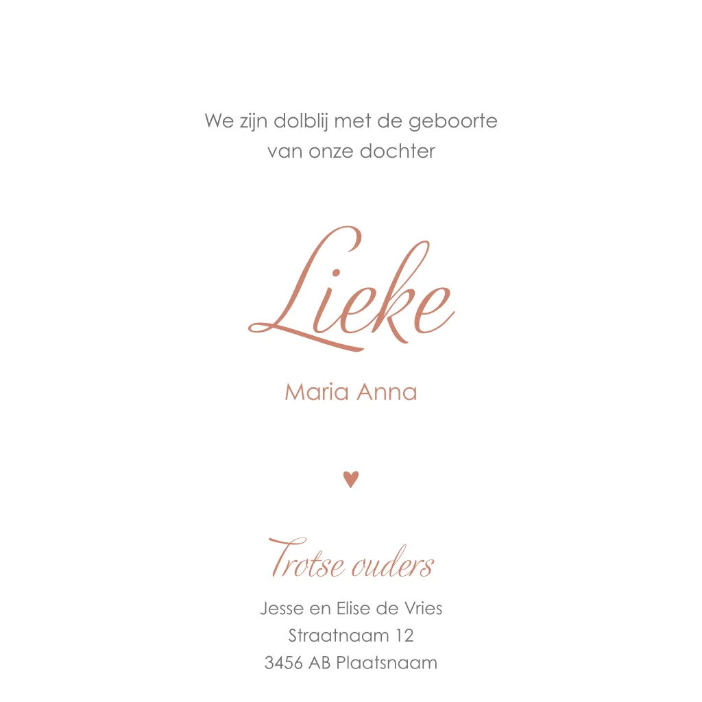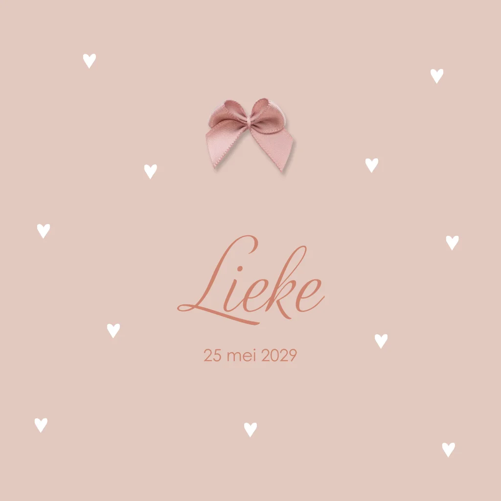 Mooi geboortekaartje in zachtroze, witte hartjes en roze strikje. De naam staat met een speels lettertype in het midden van de kaart. Boven de naam kun je een lief strikje plakken.